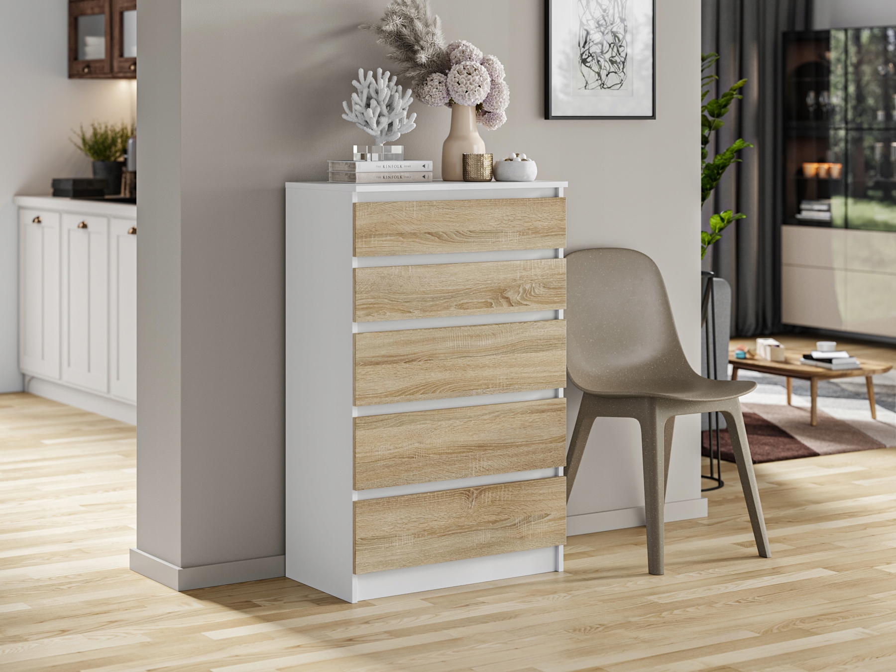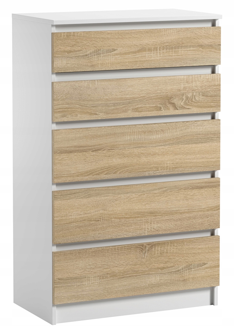 Nowoczesna, funkcjonalna i oszczędna w formie komoda z 5 pojemnymi szufladami – idealne rozwiązanie dla osób ceniących porządek i elegancję w aranżacji wnętrz. Smukła bryła świetnie sprawdzi się zarówno w sypialni, salonie czy pokoju młodzieżowym, jak i w przedpokoju, biurze lub łazience. Dzięki praktycznym szufladom bez trudu uporządkujesz odzież, bieliznę, dokumenty oraz akcesoria domowe.