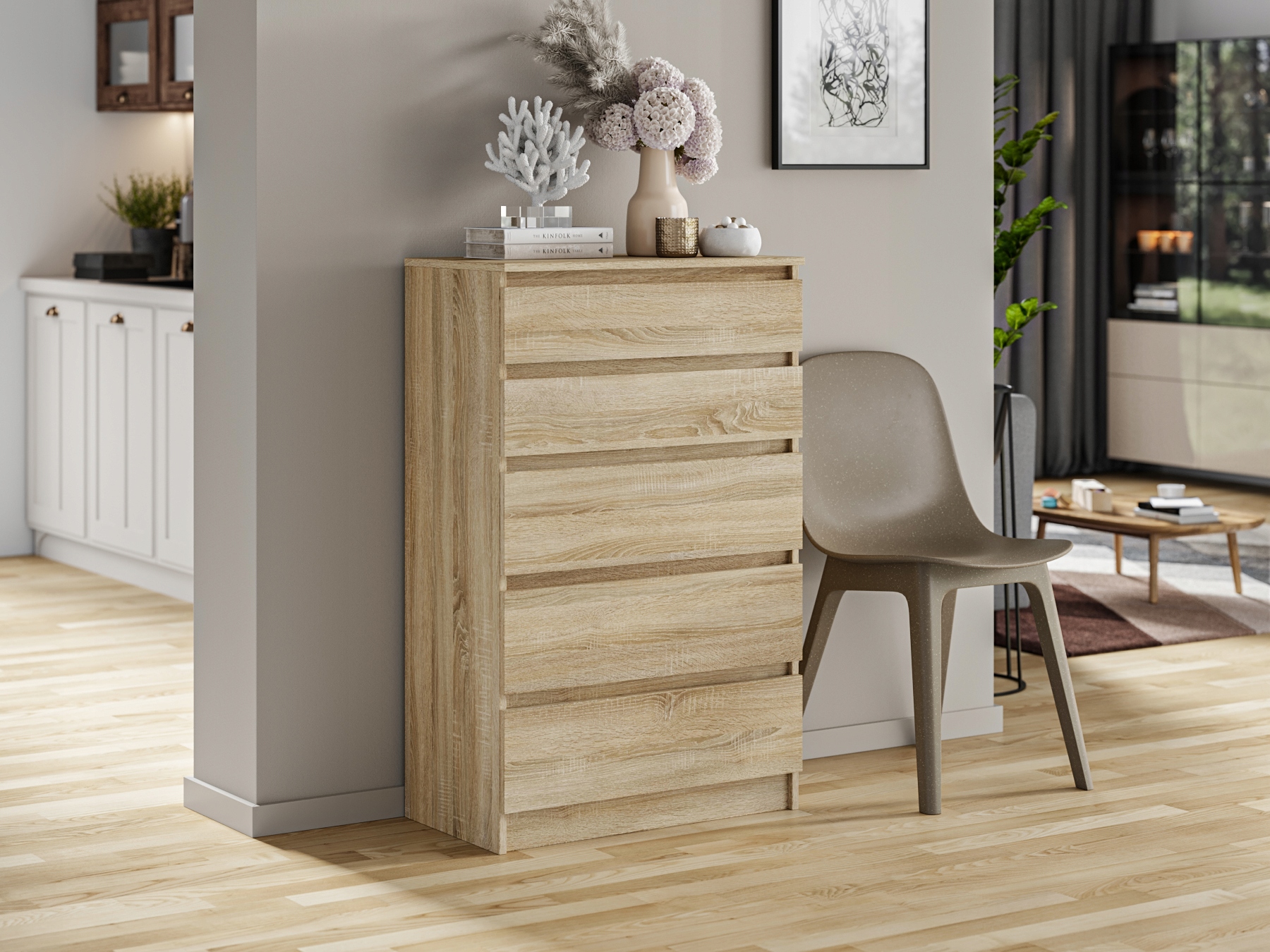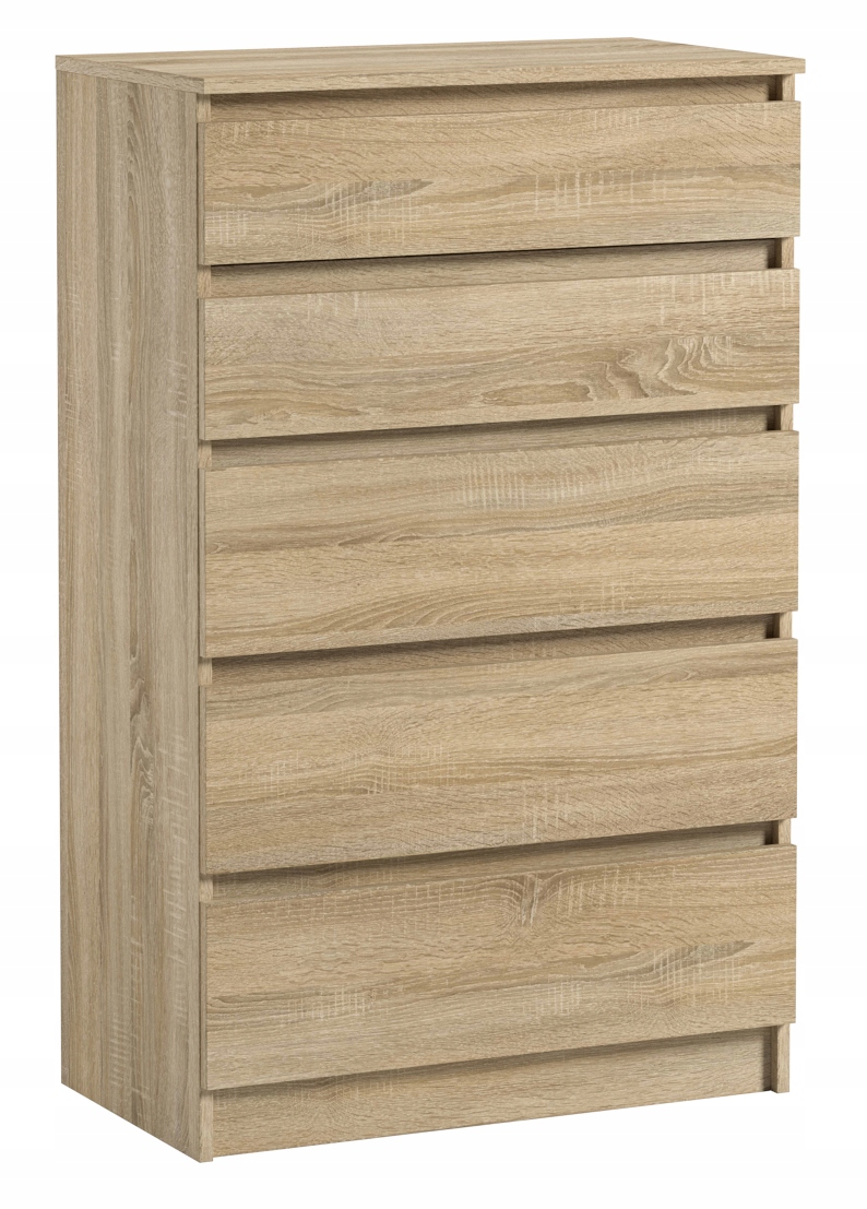 Nowoczesna, funkcjonalna i oszczędna w formie komoda z 5 pojemnymi szufladami – idealne rozwiązanie dla osób ceniących porządek i elegancję w aranżacji wnętrz. Smukła bryła świetnie sprawdzi się zarówno w sypialni, salonie czy pokoju młodzieżowym, jak i w przedpokoju, biurze lub łazience. Dzięki praktycznym szufladom bez trudu uporządkujesz odzież, bieliznę, dokumenty oraz akcesoria domowe.