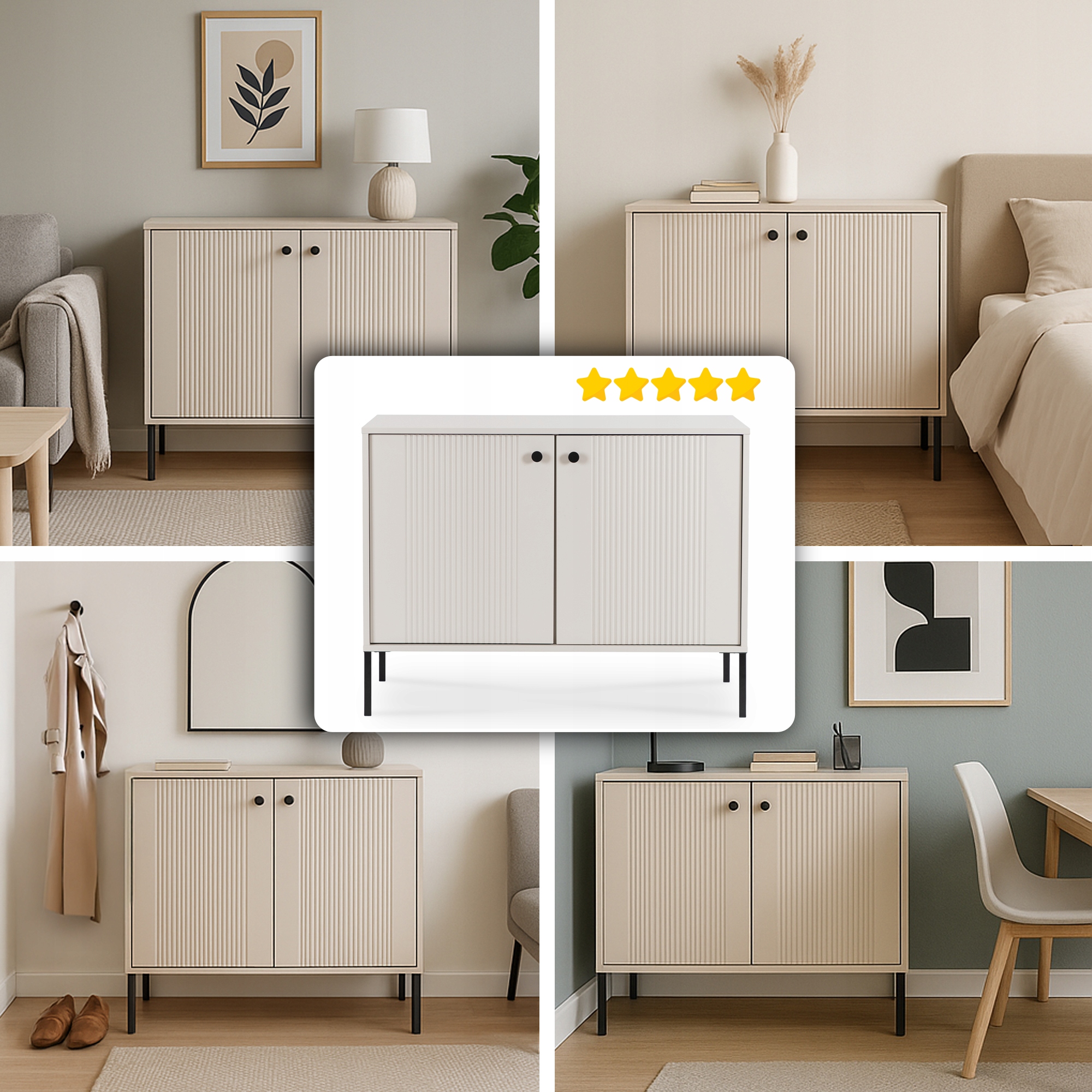 - W salonie – jako elegancki, wolnostojący mebel do przechowywania. Ustaw na niej designerską lampę, wazony lub ramki ze zdjęciami, tworząc stylową kompozycję.