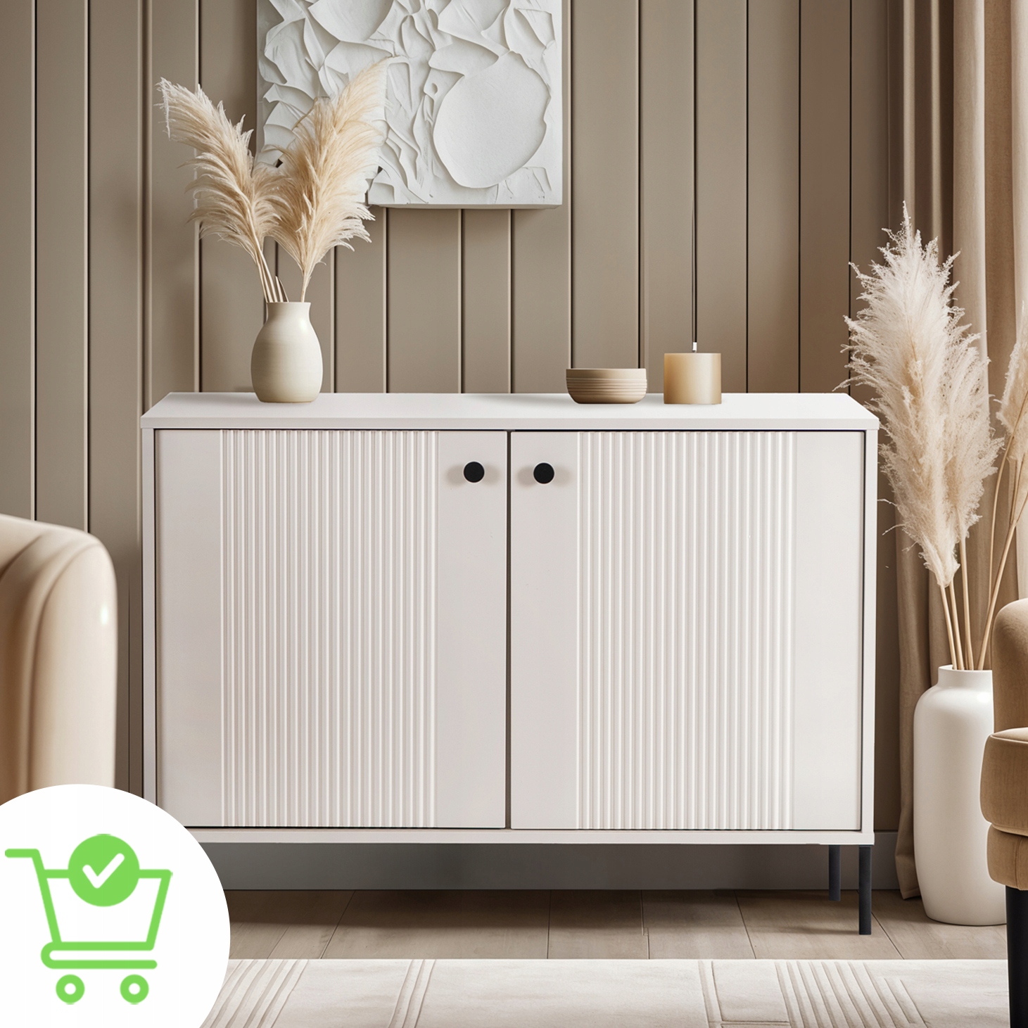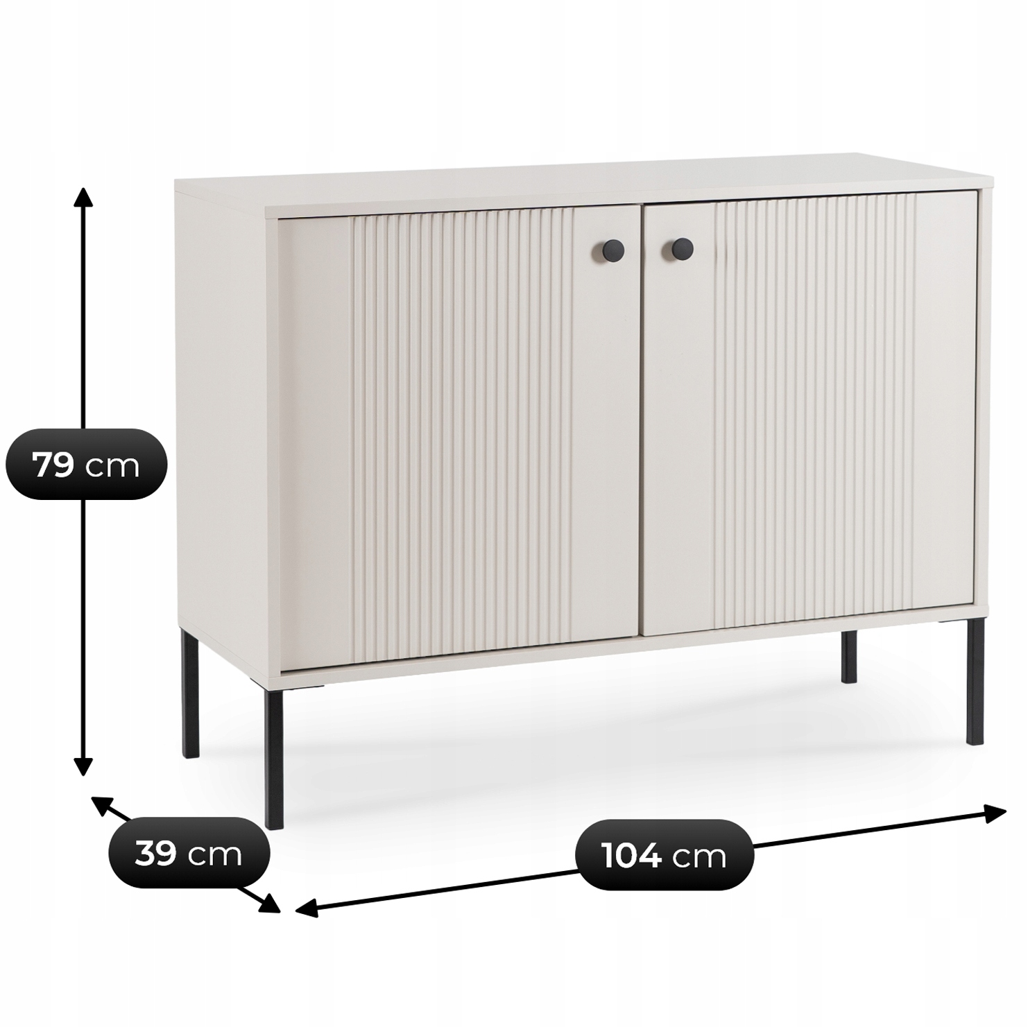 Komoda o wymiarach 104 x 39 x 79 cm to nowoczesny i funkcjonalny mebel idealny do salonu, sypialni. Fronty drzwiczek zdobi eleganckie ryflowanie, które nadaje meblowi unikalny i nowoczesny charakter. Wewnątrz znajdują się pojemne półki, które zapewniają funkcjonalną przestrzeń do przechowywania. Czarne nogi oraz czarne uchwyty dodają jej elegancji, sprawiając, że świetnie wpisuje się w nowoczesne wnętrza.