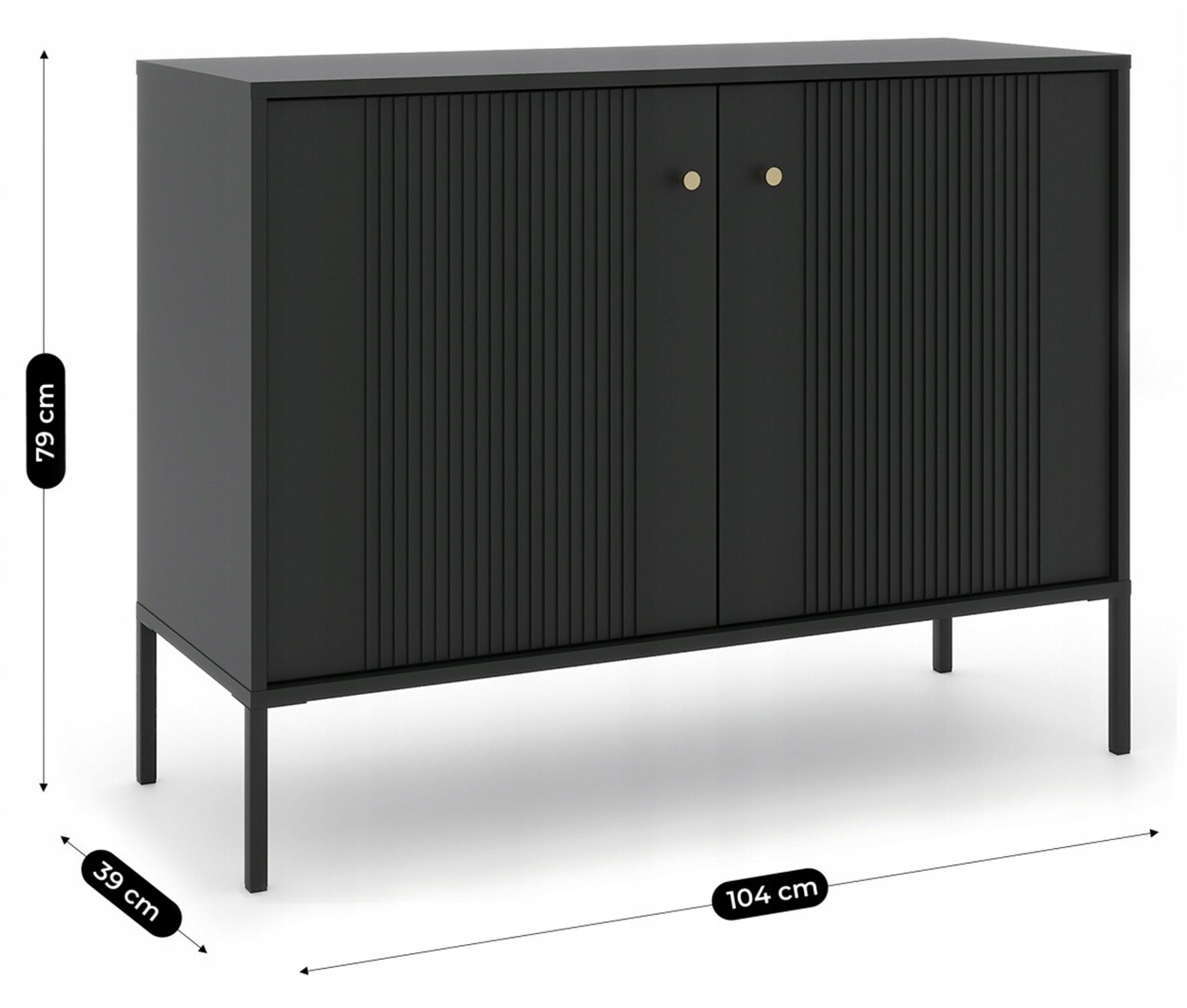 Komoda o wymiarach 104 x 39 x 79 cm to nowoczesny i funkcjonalny mebel idealny do salonu, sypialni. Jej design podkreślają ryflowane drzwiczki oraz funkcjonalne półki, które zapewniają dużą przestrzeń do przechowywania. Stabilne, czarne nogi w połączeniu ze złotymi uchwytami nadają jej elegancji.