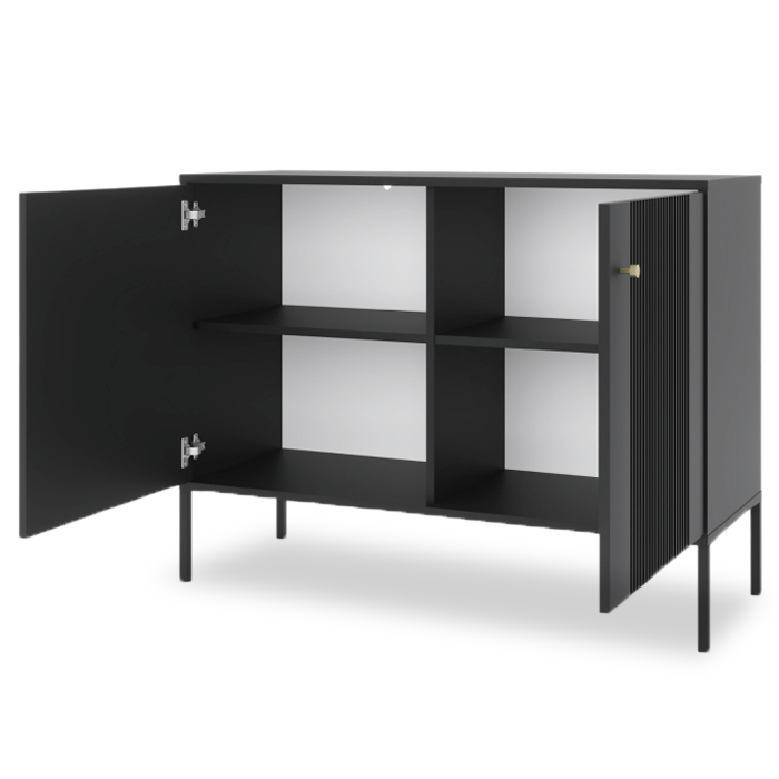 Wnętrze komody jest podzielone na cztery równe sekcje, które tworzą przestronną i dobrze zorganizowaną przestrzeń. Całość utrzymana jest w głębokiej czerni. Solidne zawiasy gwarantują płynne i ciche otwieranie drzwiczek, dodając meblowi komfortu w codziennym użytkowaniu.