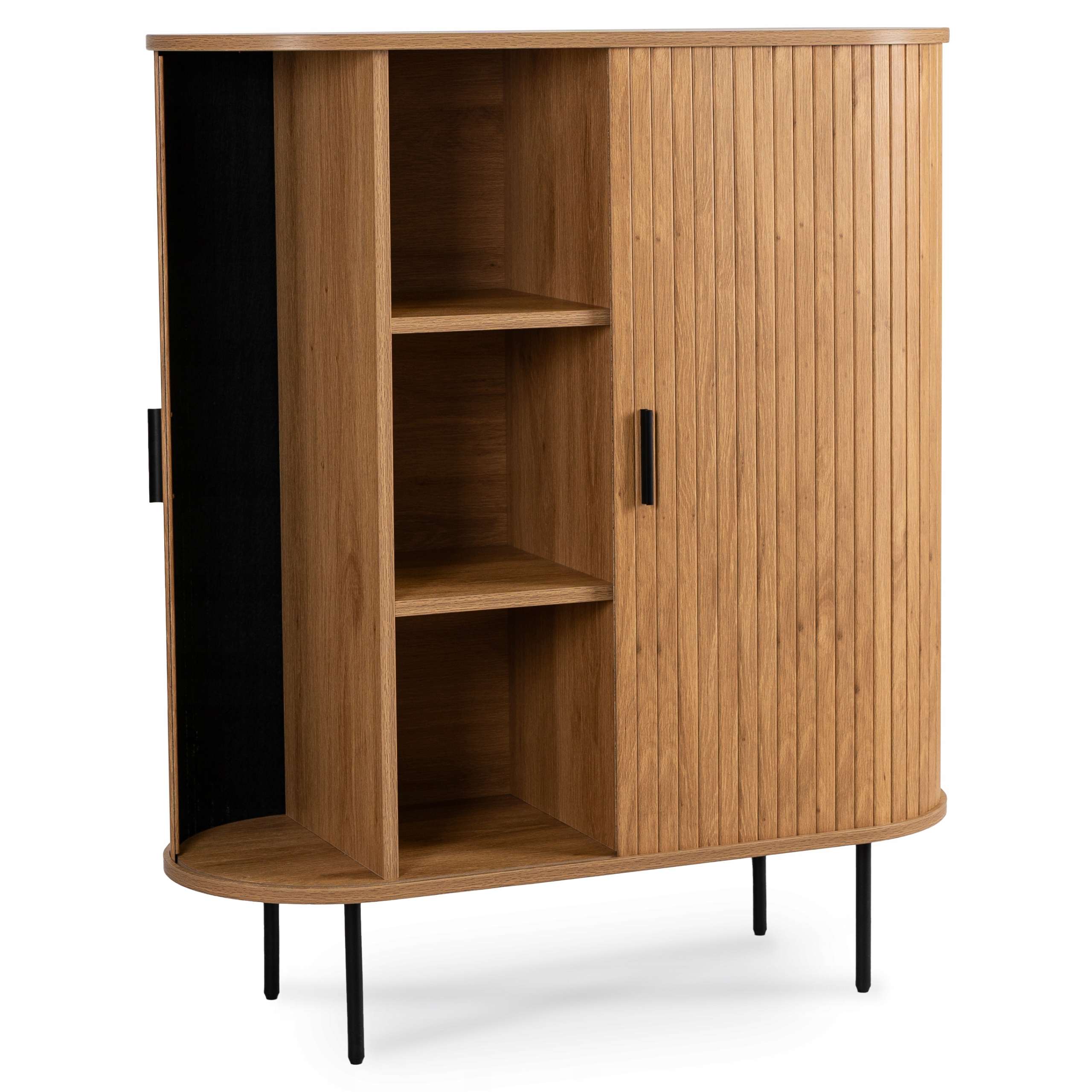 Komoda o wymiarach 100 x 40 x 118 cm to nowoczesny i funkcjonalny mebel idealny do salonu, sypialni. Jej design podkreślają stylowe lamele oraz zaokrąglone boki. Loftowego charakteru nadają metalowe nóżki i uchwyty.