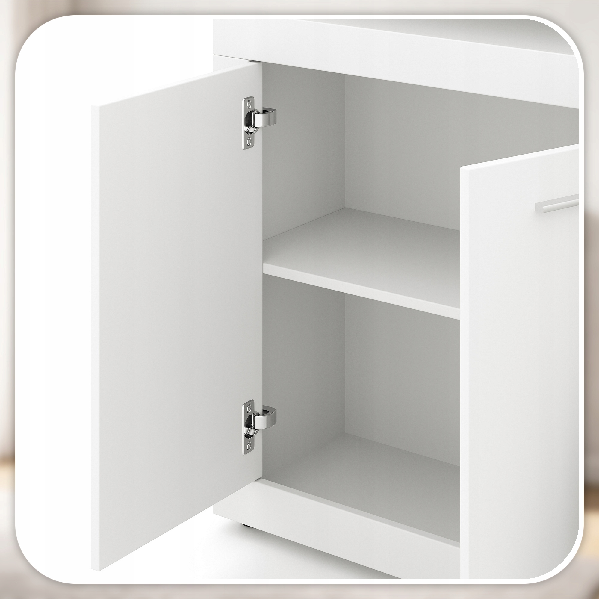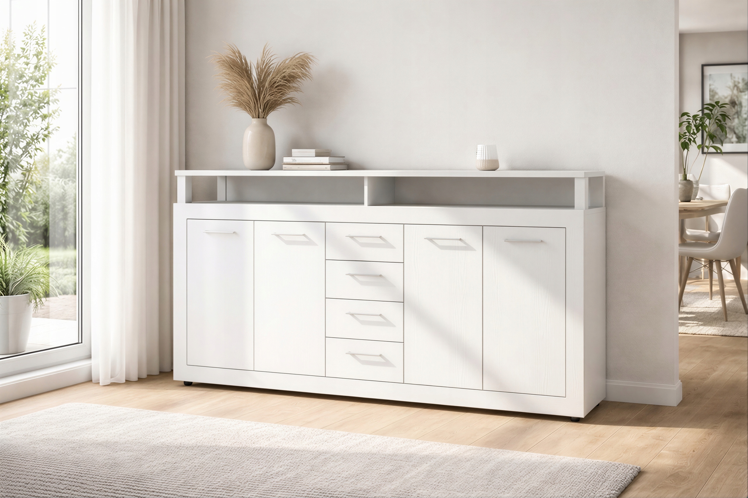 - Nowoczesny design – minimalistyczna, biała bryła z wyraźnymi podziałami frontów doskonale wpisuje się w aranżacje salonu, jadalni lub biura.