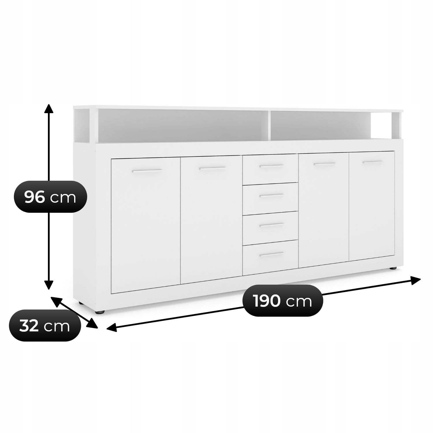 Szerokość komody wynosi 190 cm, wysokość 96 cm, a głębokość 32 cm. Dzięki temu model oferuje dużą przestrzeń do przechowywania, zachowując przy tym smukłą, nowoczesną formę.