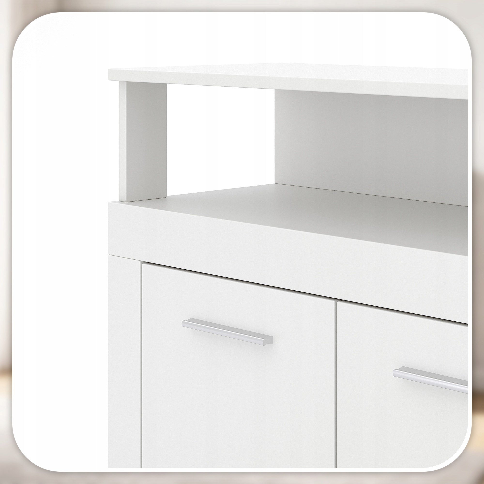 Model LUNA BIAŁA posiada pojemne szafki z półkami po bokach oraz cztery praktyczne szuflady w centralnej części. Dodatkowo nad blatem znajduje się otwarta półka w formie nadstawki, idealna na dekoracje, książki lub sprzęt RTV.
