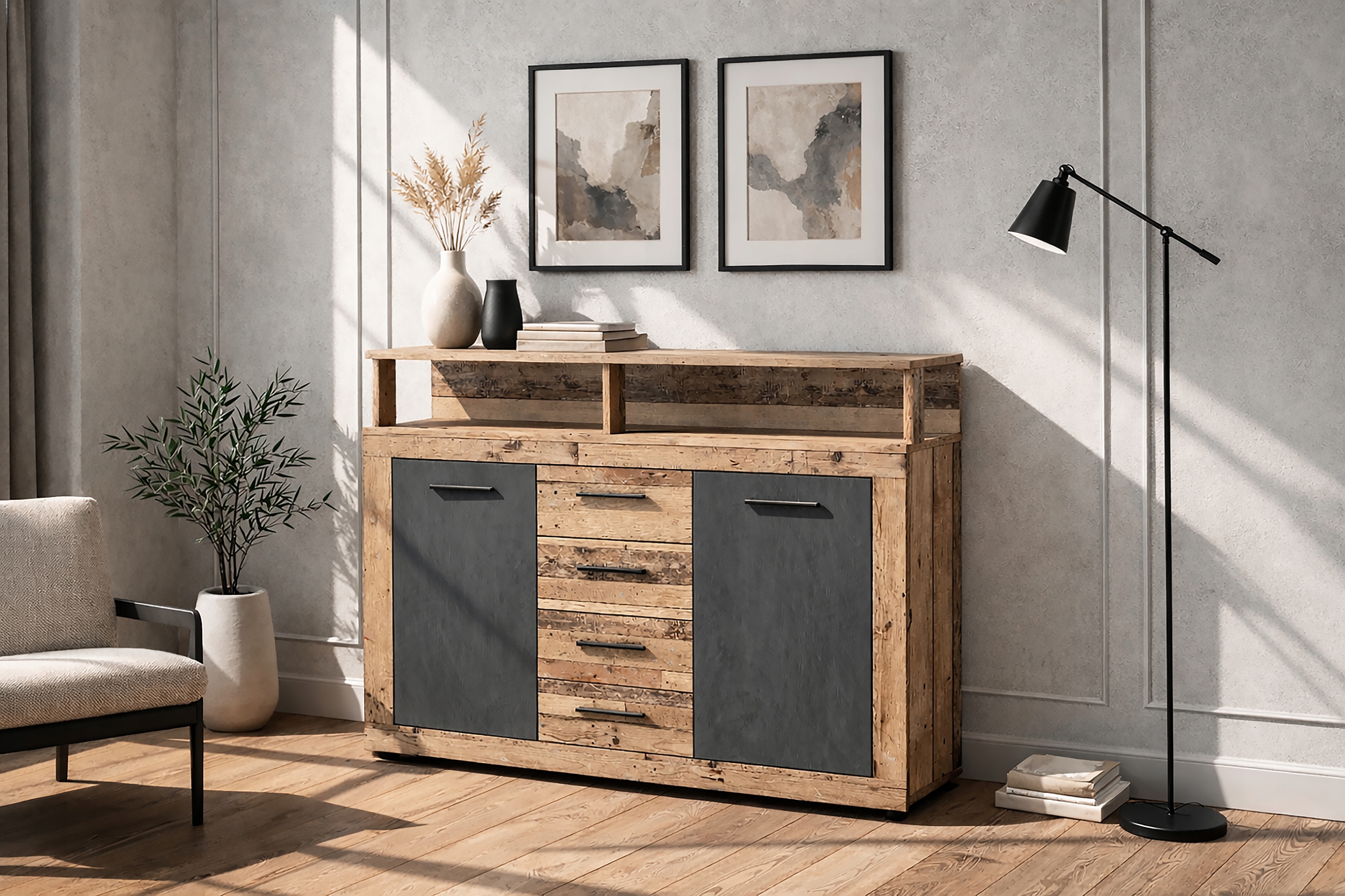 Komoda BLAGO MIDI B w kolorze dąb/grafit to doskonała propozycja dla osób ceniących minimalistyczne wzornictwo, dużą pojemność i solidność wykonania. Świetnie sprawdzi się w salonie, sypialni, przedpokoju czy biurze – wszędzie tam, gdzie liczy się design i wygoda przechowywania.