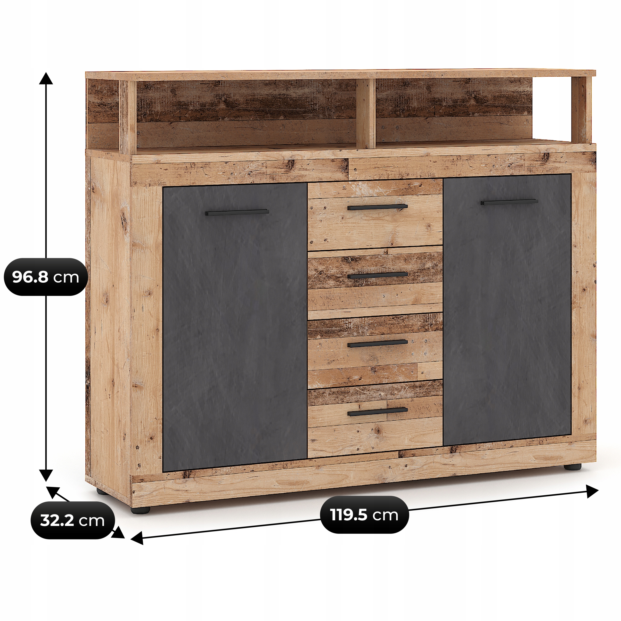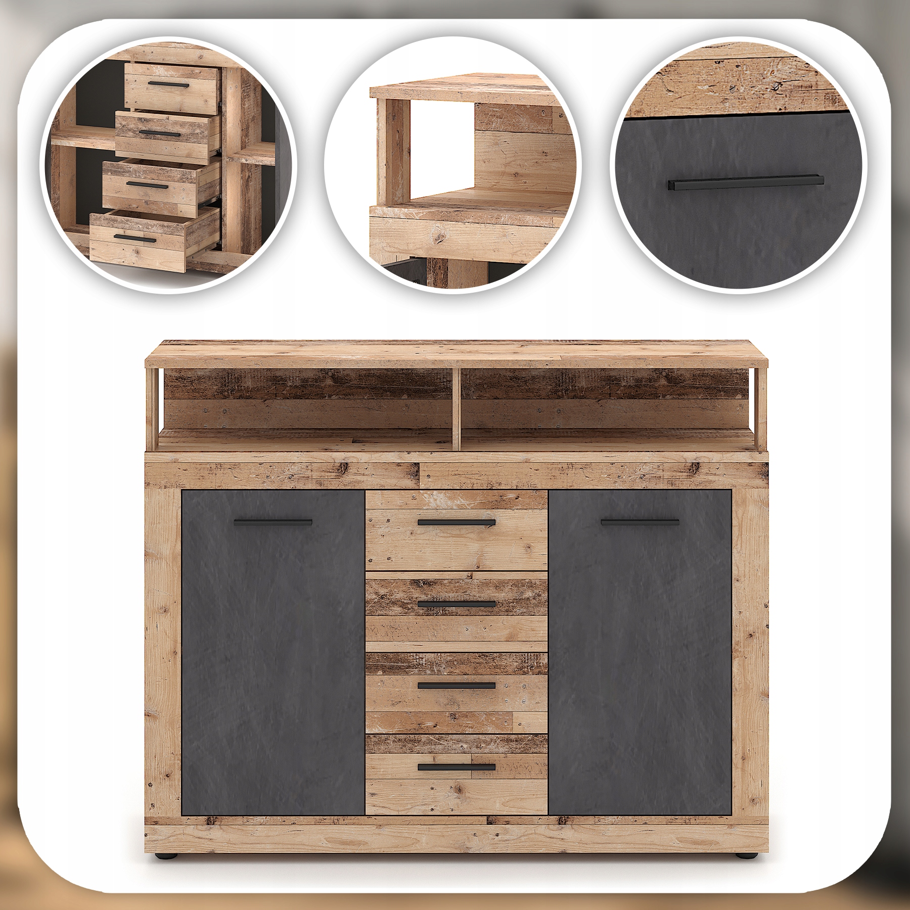 - Cztery pojemne szuflady i dwie zamykane szafki – idealne do przechowywania ubrań, dokumentów, naczyń lub innych codziennych przedmiotów.