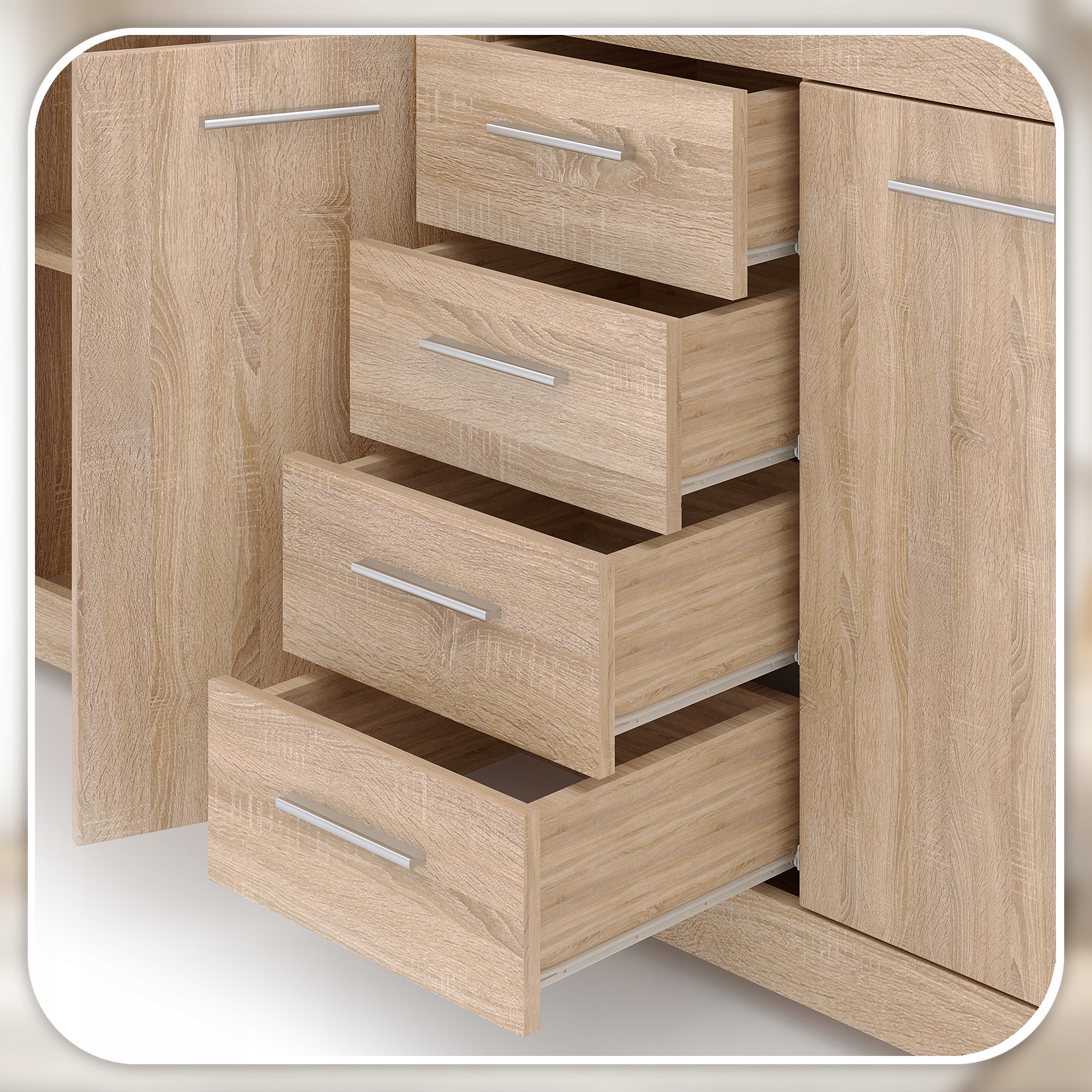 Komoda LUNA Sonoma została wyposażona w cztery przestronne szuflady, które ułatwiają uporządkowane przechowywanie. Dzięki płynnie działającym prowadnicom zapewniają komfortowy dostęp do zawartości, a minimalistyczne uchwyty podkreślają nowoczesny i elegancki charakter mebla.