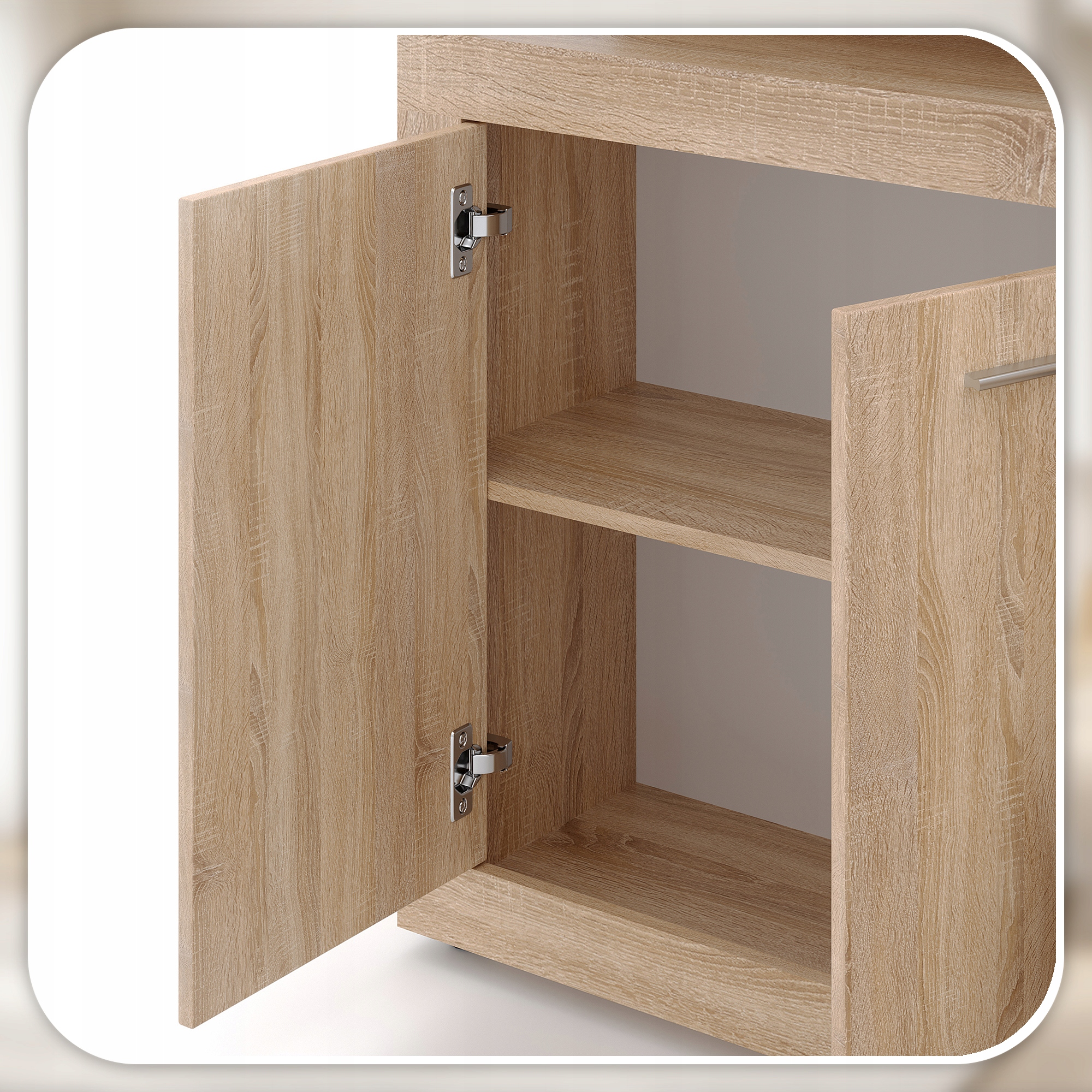 Komoda LUNA Sonoma została wyposażona w wysokiej jakości zawiasy, które zapewniają ciche i płynne otwieranie oraz zamykanie drzwiczek. Mechanizm pracuje lekko i bez trzaskania, co znacząco podnosi komfort codziennego użytkowania. Solidne mocowania gwarantują stabilność frontów oraz trwałość na długie lata.