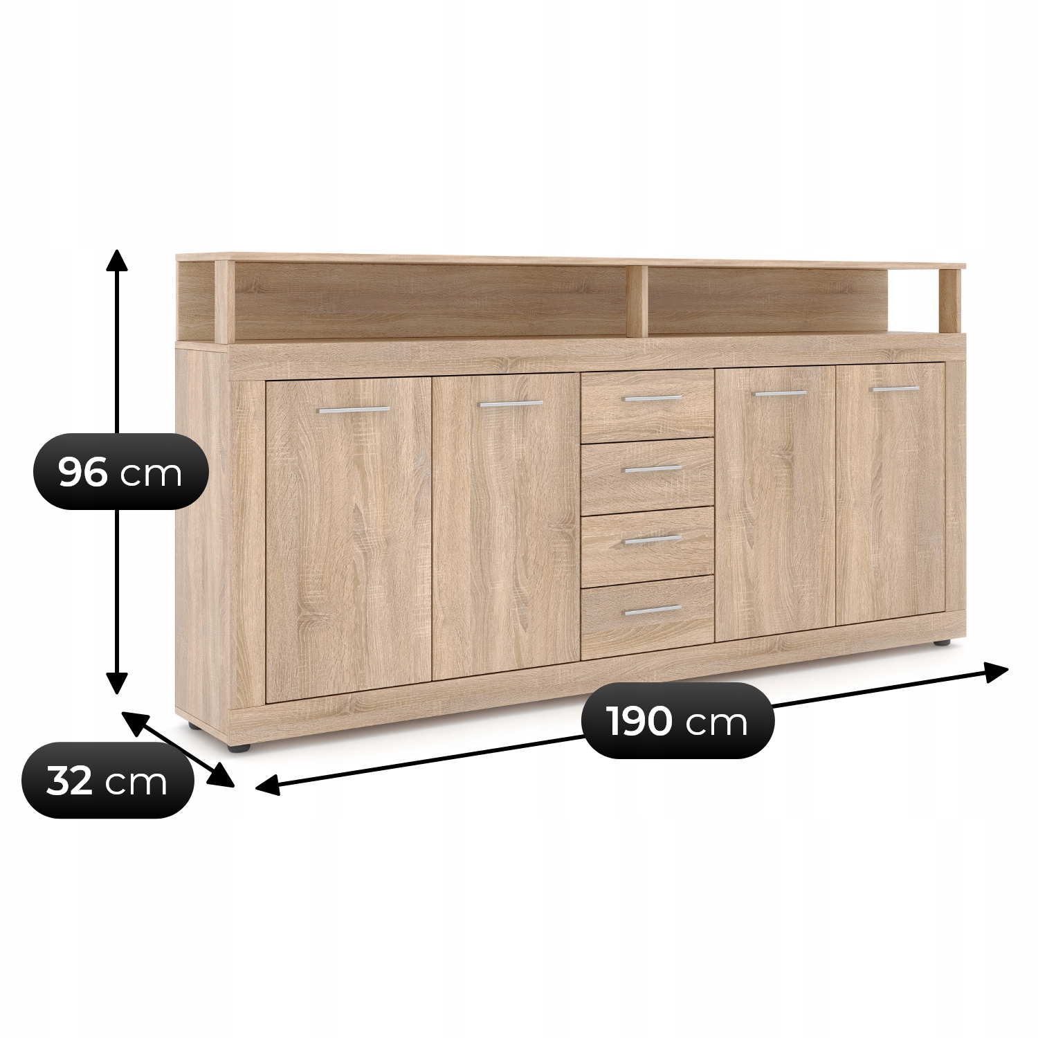 Szerokość komody wynosi 190 cm, wysokość 96 cm, a głębokość 32 cm. Dzięki temu model oferuje dużą przestrzeń do przechowywania, zachowując przy tym smukłą, nowoczesną formę.