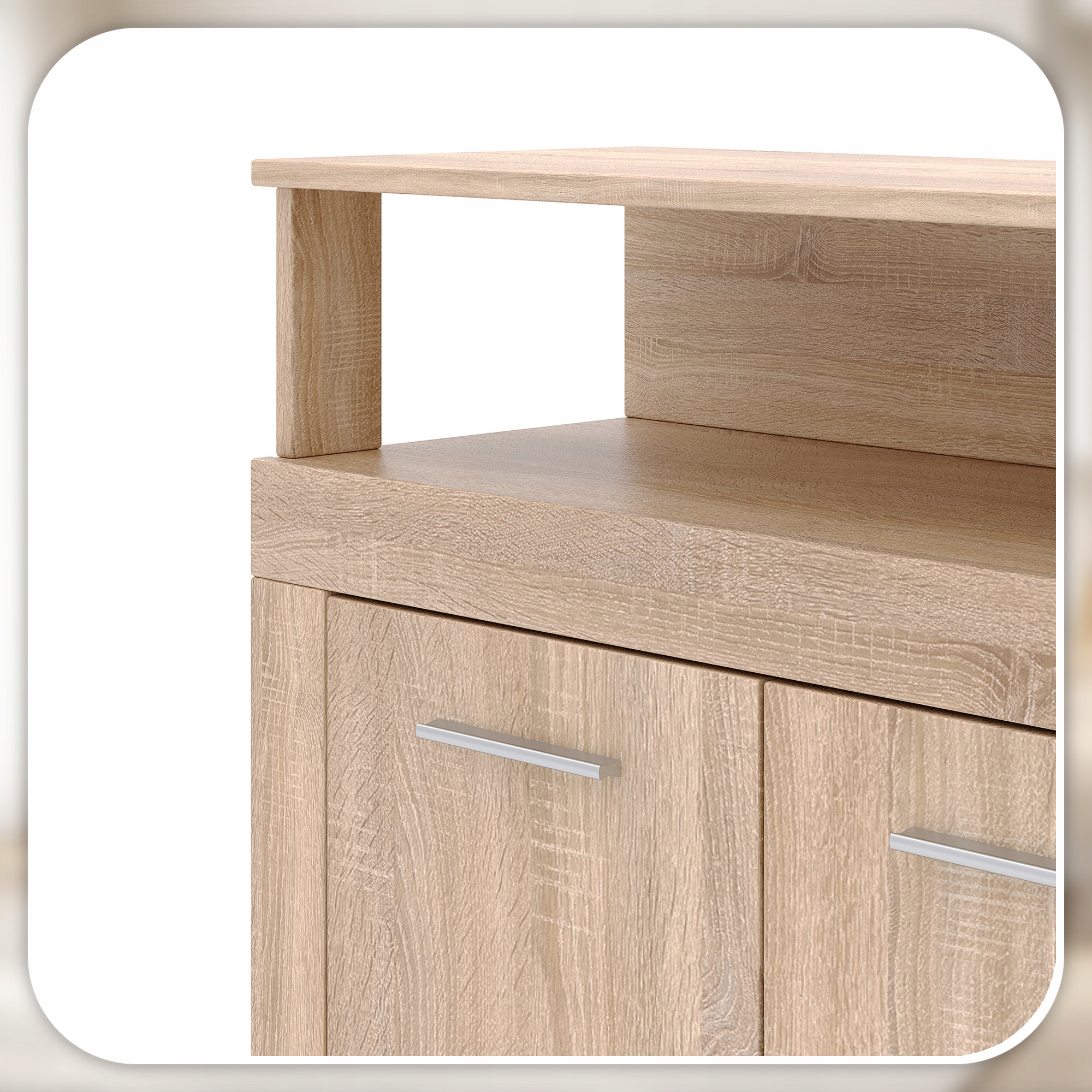 Model LUNA SoNOMA posiada pojemne szafki z półkami po bokach oraz cztery praktyczne szuflady w centralnej części. Dodatkowo nad blatem znajduje się otwarta półka w formie nadstawki, idealna na dekoracje, książki lub sprzęt RTV.