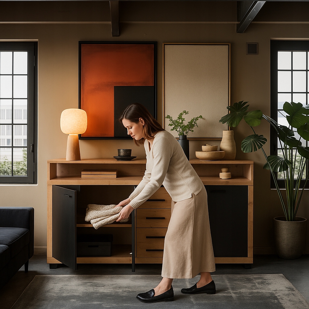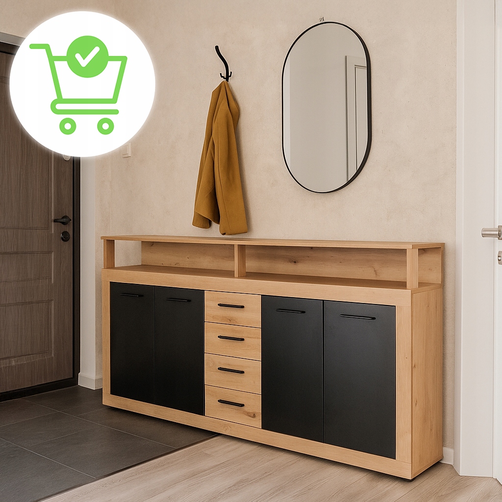 - Dla rodzin z dziećmi – trwałe materiały, bezpieczne krawędzie i łatwe czyszczenie sprawiają, że komoda doskonale sprawdzi się w salonie czy przedpokoju pełnym codziennego życia.