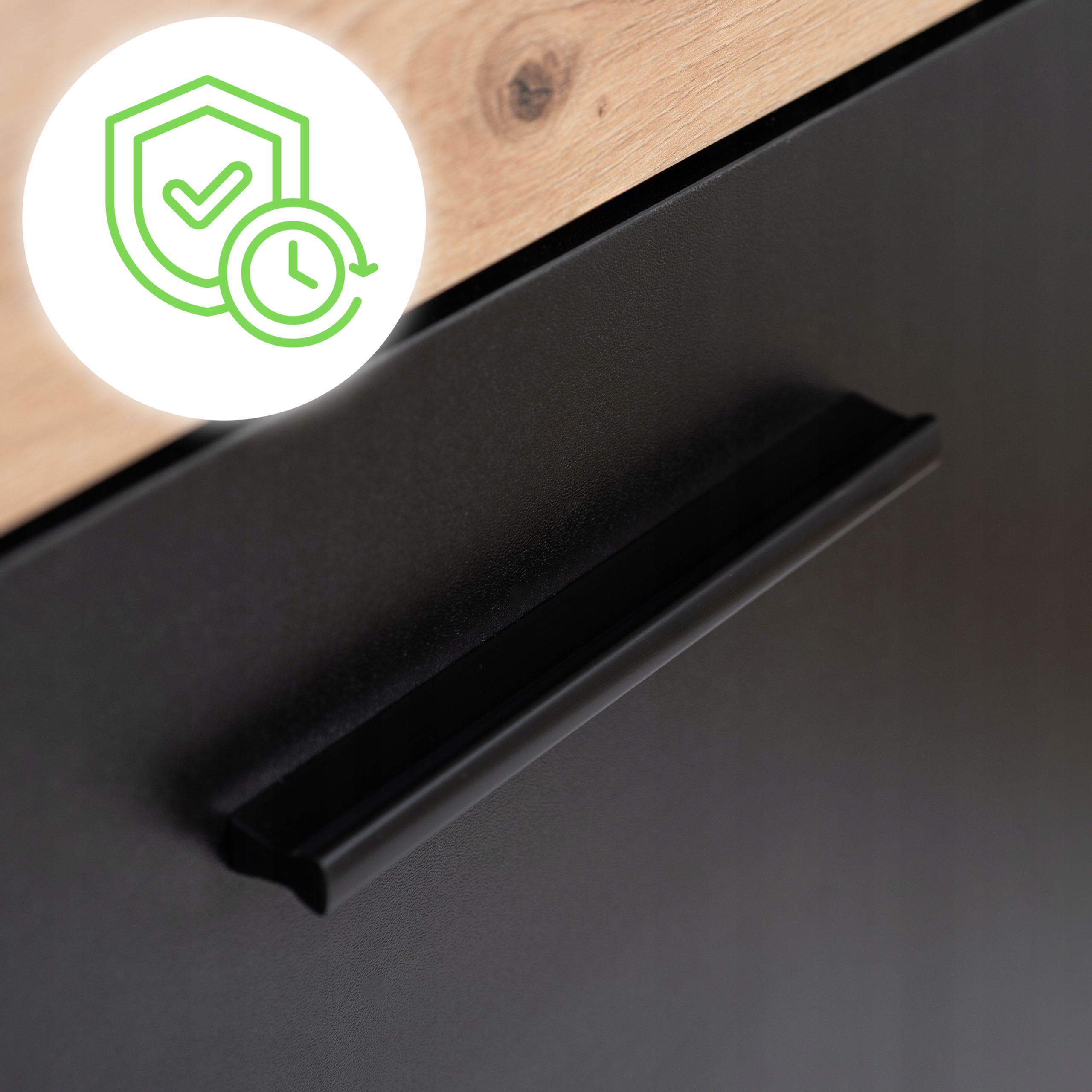 - Fronty w głębokim czarnym macie i korpus w dekorze Dąb Artisan – stylowe połączenie, które nada charakteru każdemu wnętrzu.