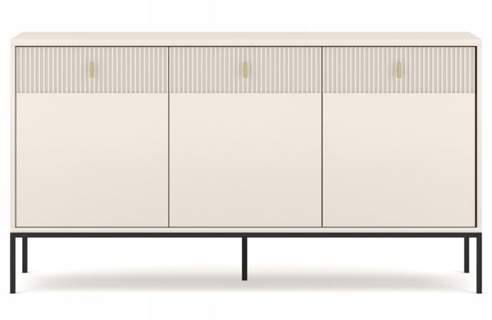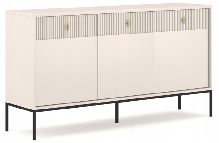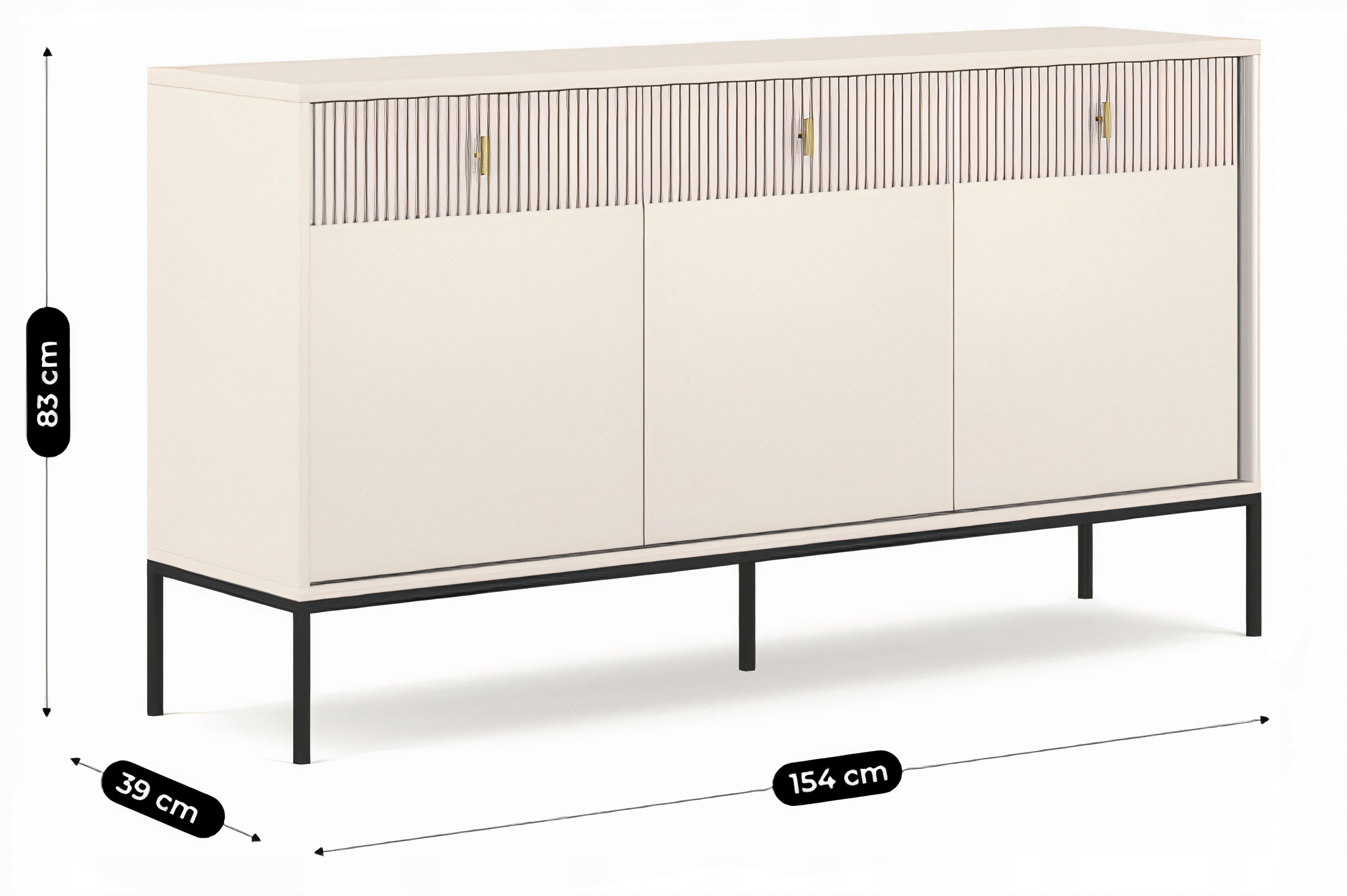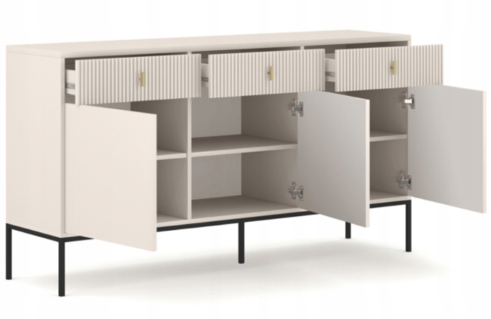 Komoda o wymiarach 154 x 39 x 83 cm to nowoczesny i funkcjonalny mebel idealny do salonu, sypialni. Jej design podkreśla stylowe ryflowanie oraz złote uchwyty.