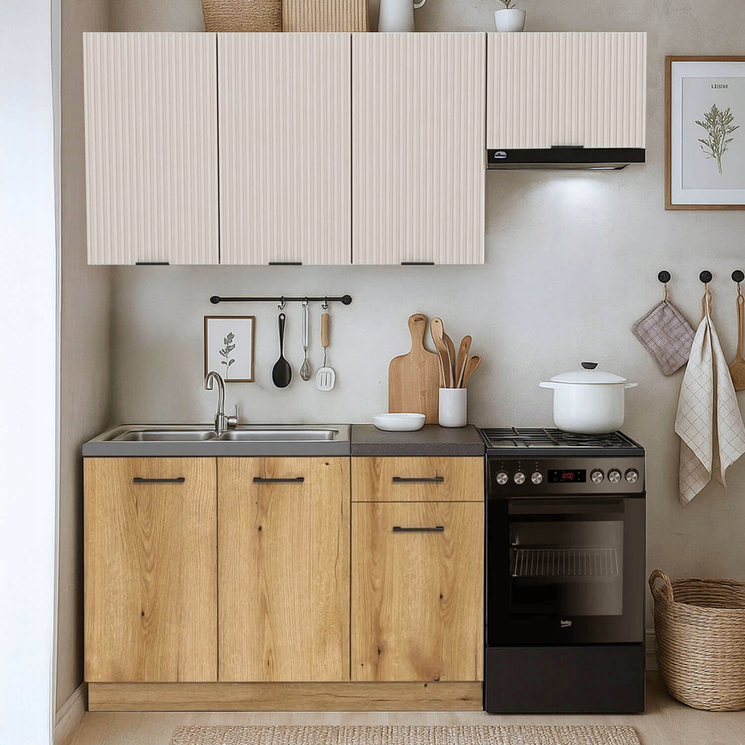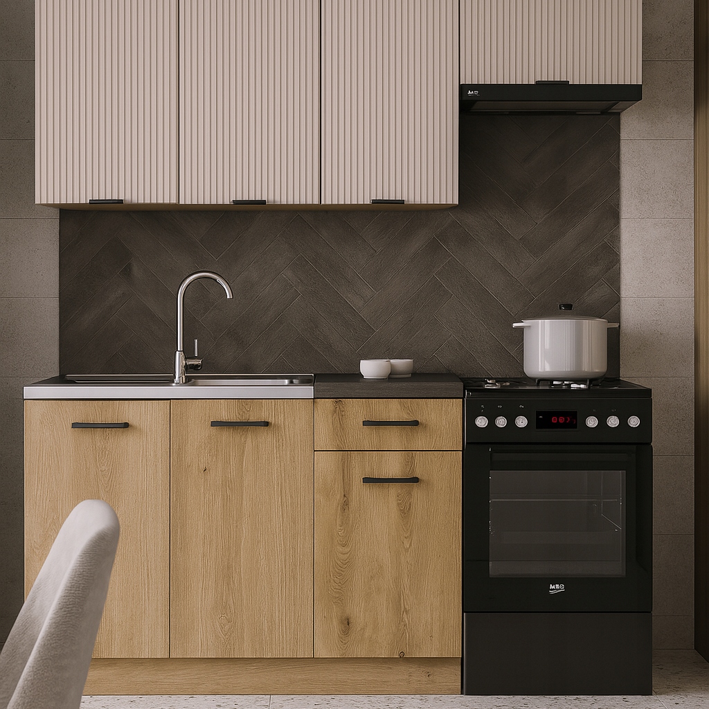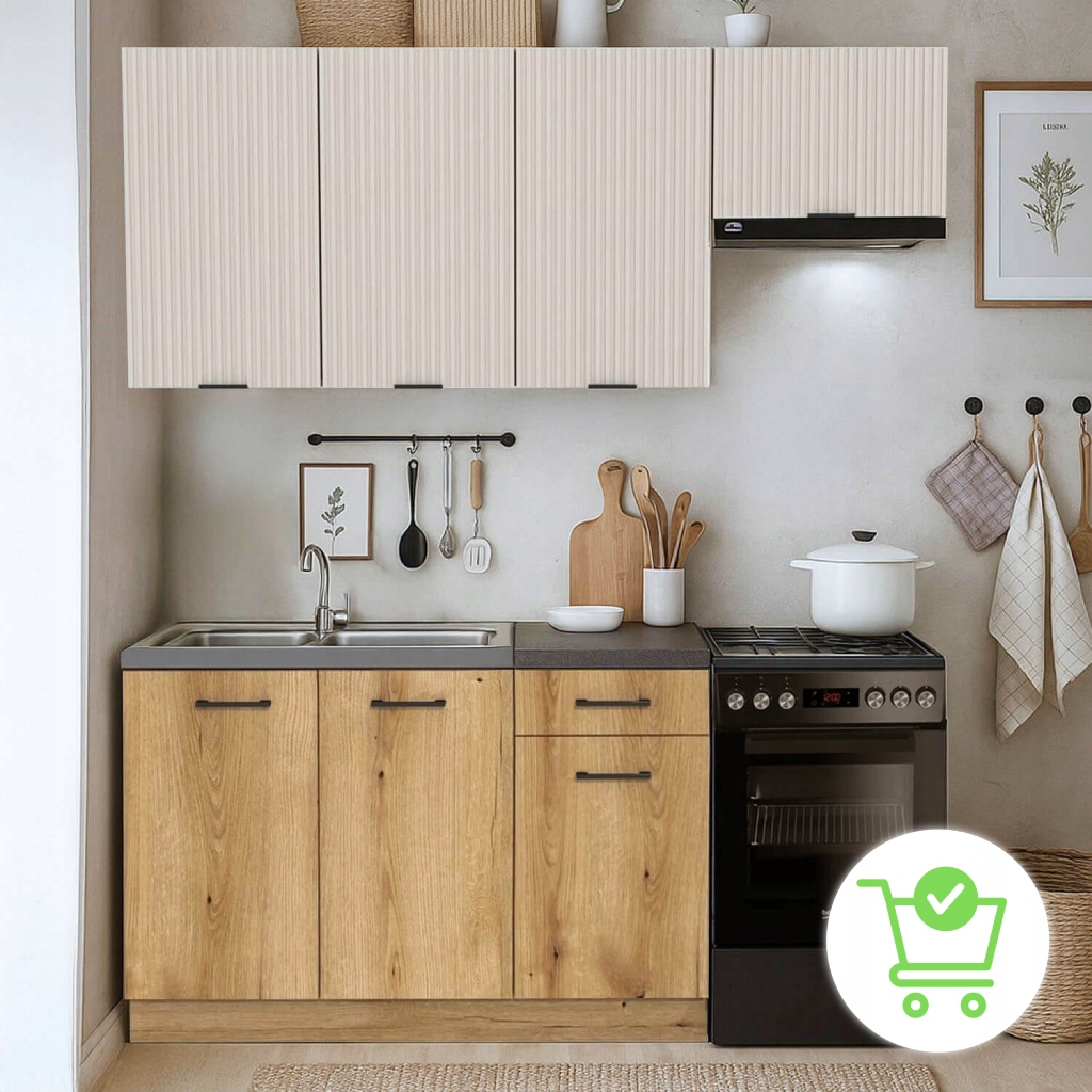 Kuchnia MODERN to nowoczesne i praktyczne rozwiązanie dla osób szukających funkcjonalnego zestawu kuchennego o kompaktowych wymiarach i estetycznym wyglądzie. Idealna dla tych, którzy chcą uniknąć długiego oczekiwania i skomplikowanego projektowania.