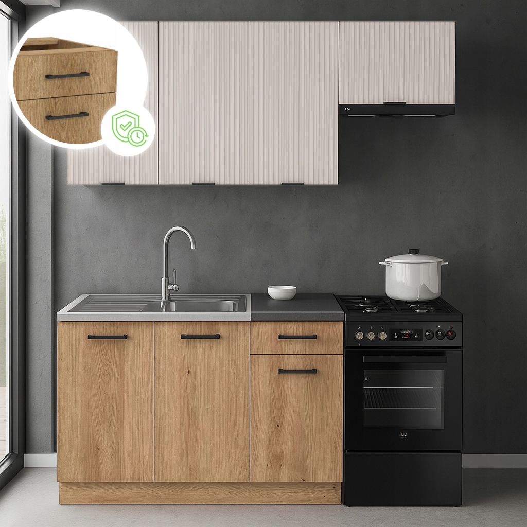 Przeglądając inne oferty zwróć uwagę na fronty, korpusy, zawiasy i prowadnice. Nasze zestawy zrobione są z płyty laminowanej (MDF lub wiórowa), która jest łatwa do czyszczenia, odporna na umiarkowaną wilgoć i zarysowania i tańsza niż lite drewno, ale wystarczająca na codzienne użytkowanie. W standardzie posiada też cichy domyk, co wydłuża żywotność mebli.