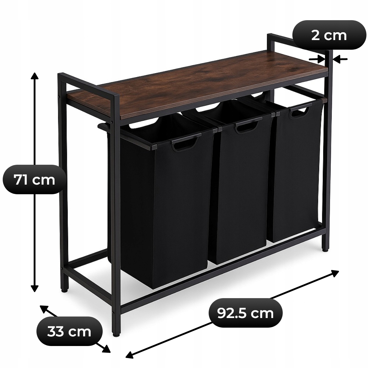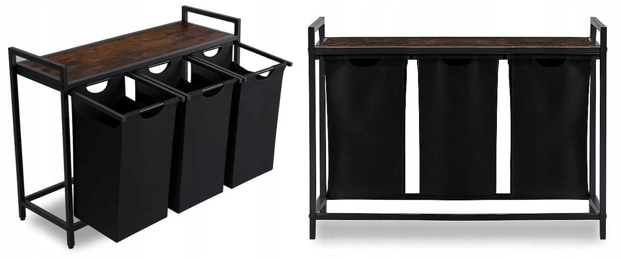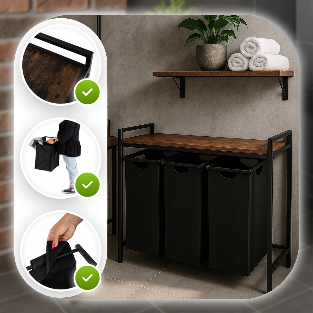 Wyjmowane torby wykonane są z odpornego na wilgoć materiału, a stabilny metalowy stelaż z blatem pozwala wykorzystać górną część jako półkę na ręczniki, środki czystości lub dekoracje.