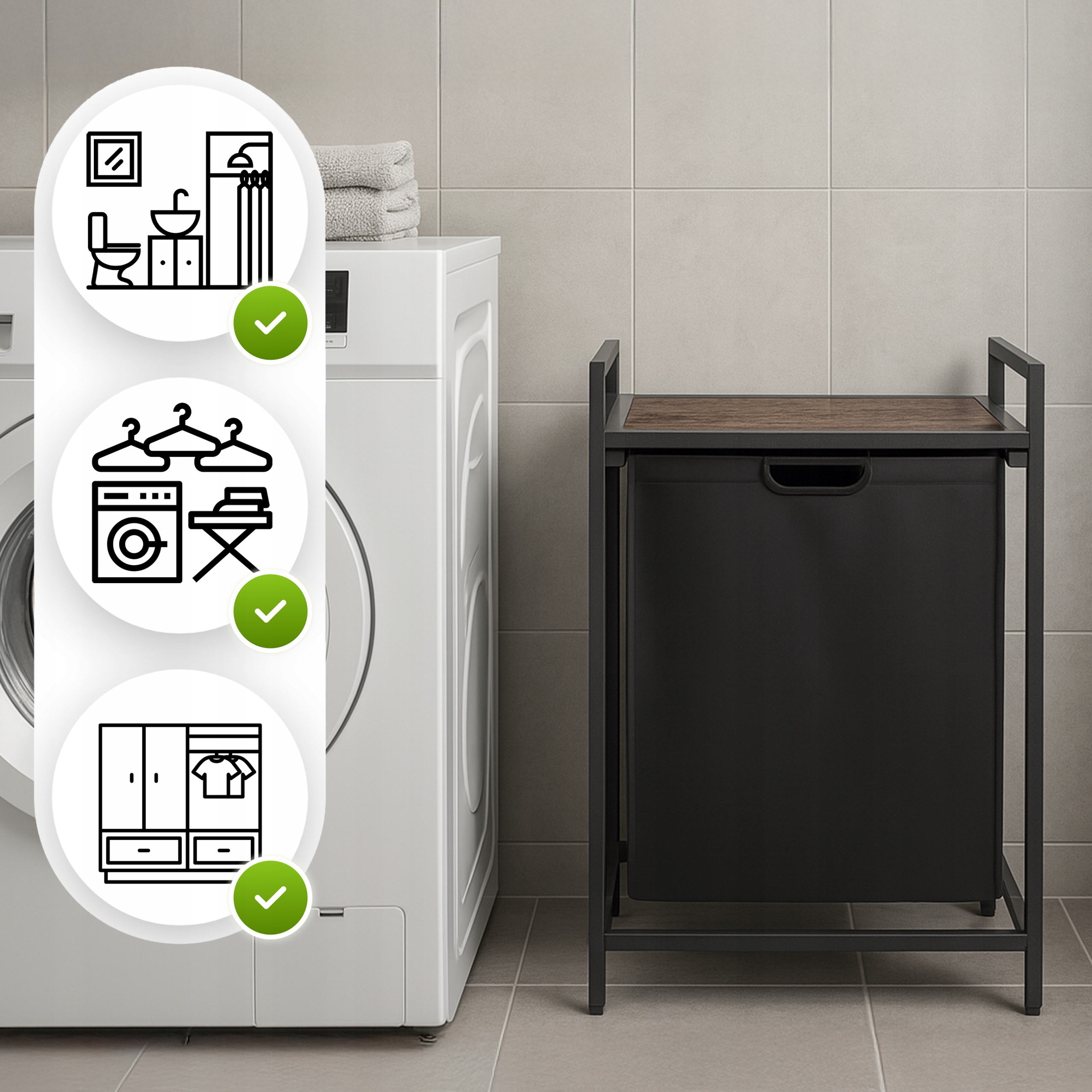 - W pralni lub pomieszczeniu gospodarczym – wygodne rozwiązanie z wyjmowanym workiem i dużą pojemnością, które ułatwia codzienną organizację prania.