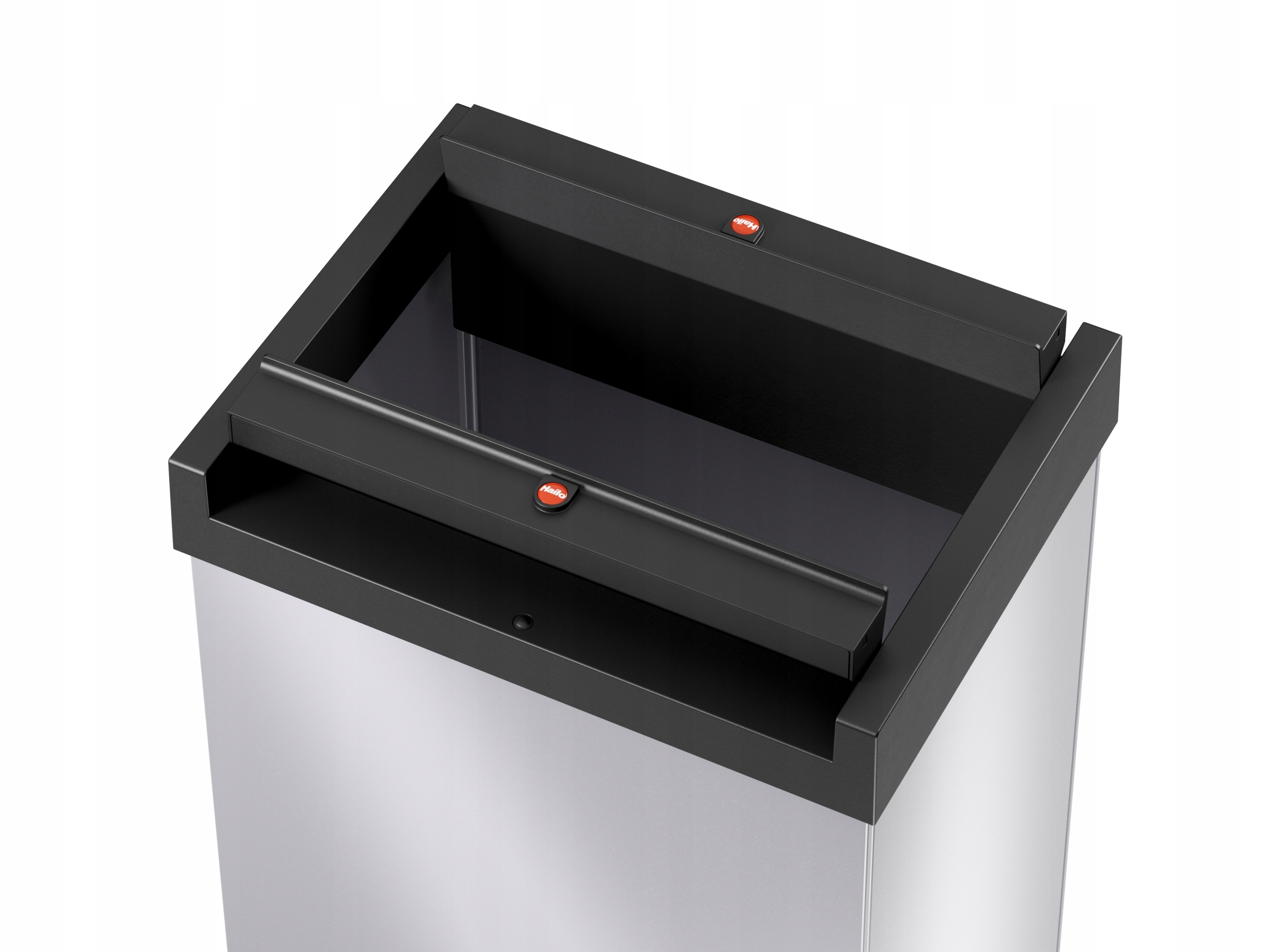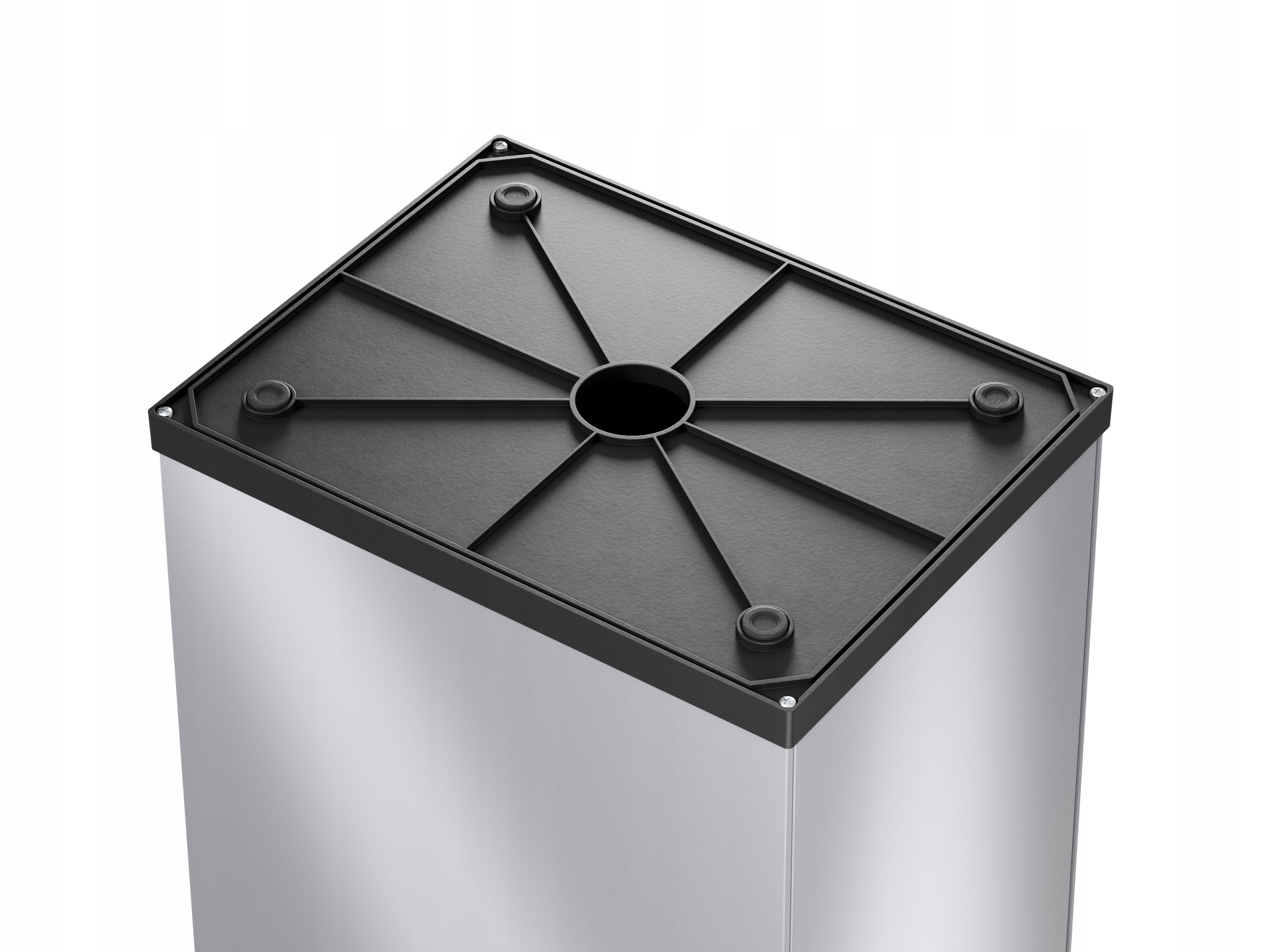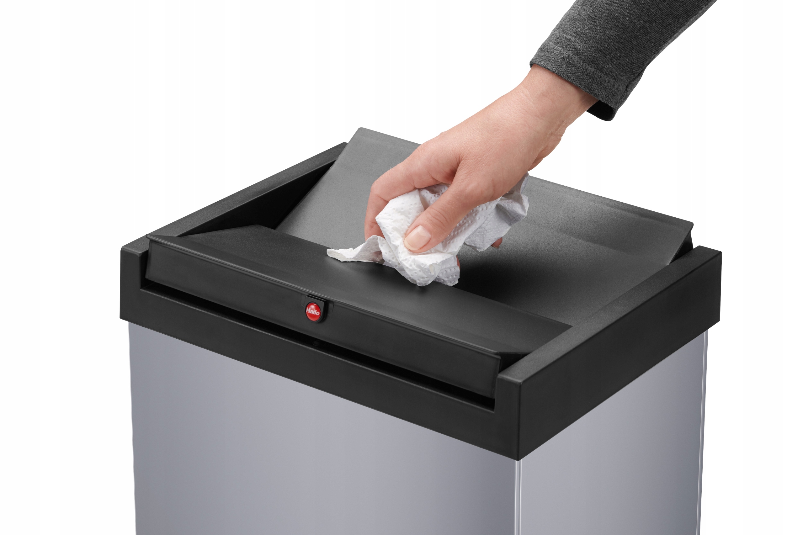 Duży kosz na odpady z samozamykającą się wahadłową pokrywą.