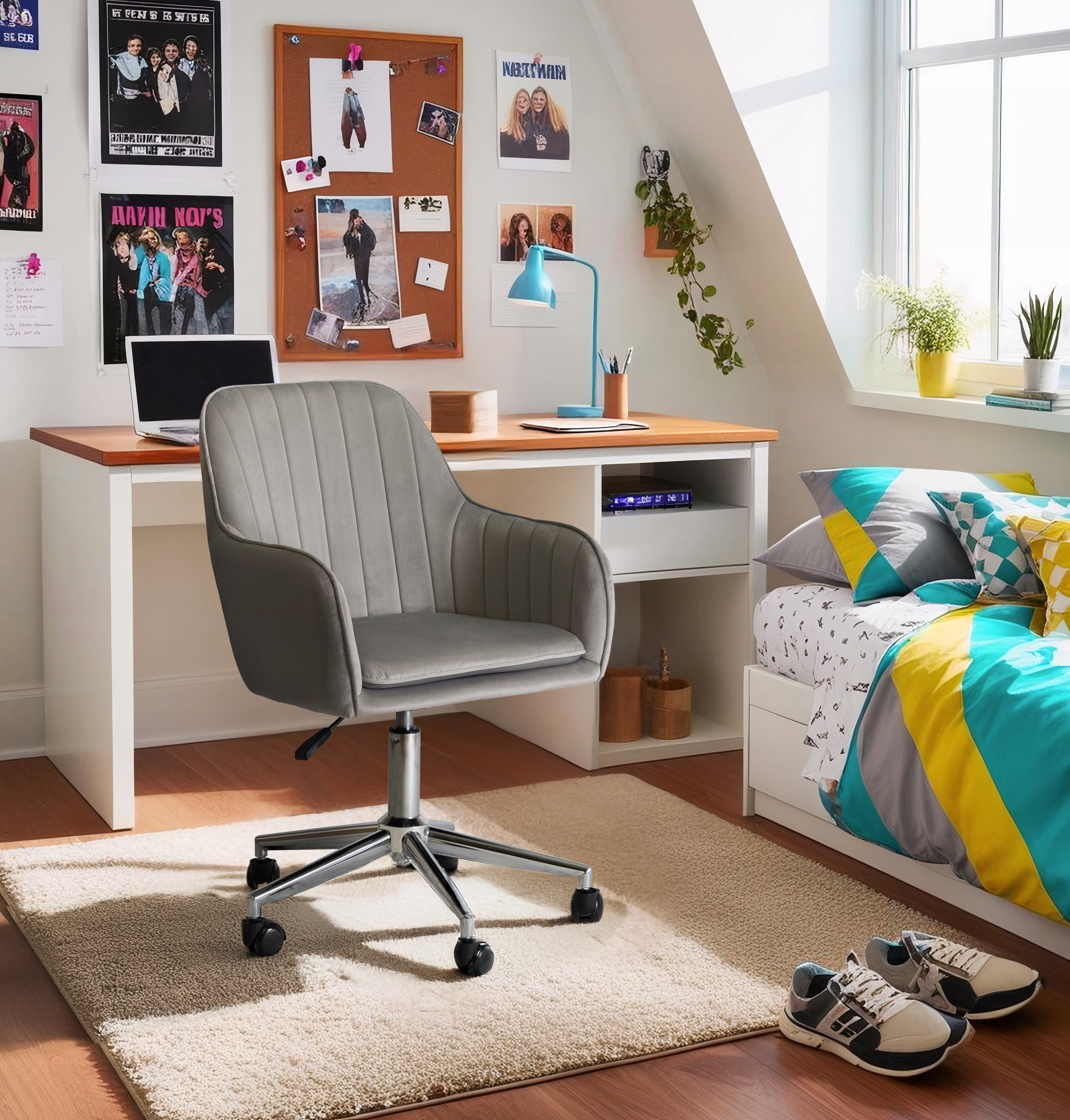 Fotel został zaprojektowany z myślą o wygodzie. Miękkie siedzisko zapewnia komfort podczas rysowania, odrabiania lekcji czy zabawy przy biurku. Regulowana wysokość pozwala dopasować go do wzrostu dziecka, a stabilna, metalowa podstawa z kółkami umożliwia swobodne i bezpieczne poruszanie się po pokoju.