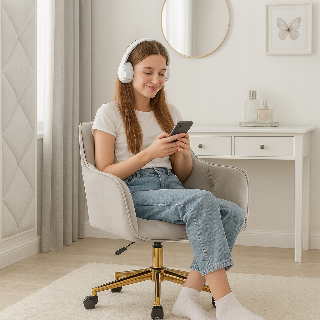 - Płynna regulacja wysokości – dostosuj siedzisko do biurka, toaletki lub stołu roboczego.
