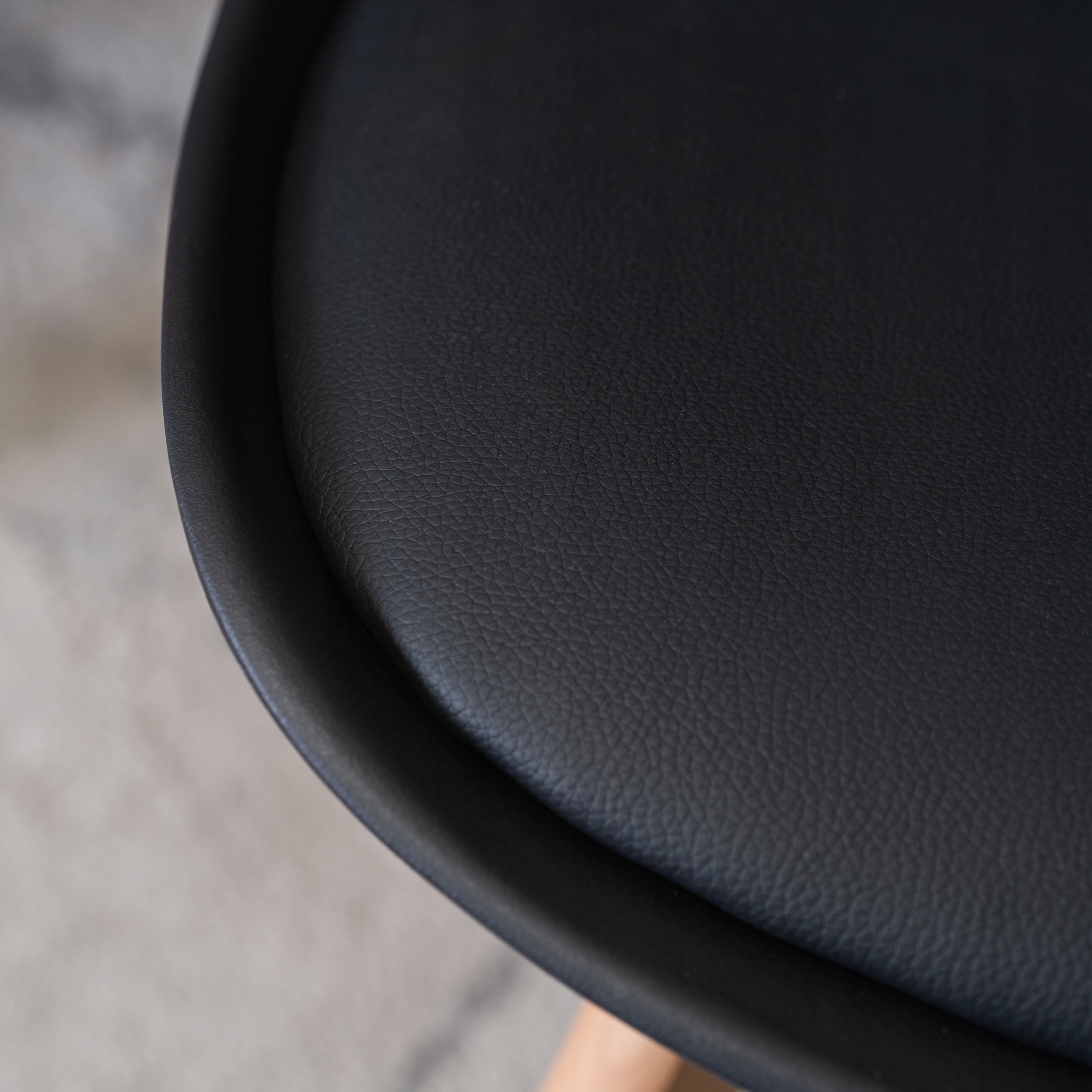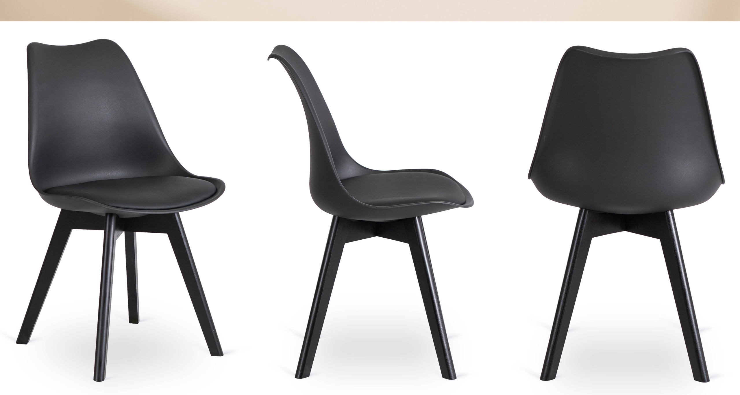 ✨ Krzesło SCANDI to doskonałe połączenie modnego designu z wygodą. Oparcie ma profilowany, wklęsły kształt, a na siedzisku znajduje się miękka tapicerowana poduszka, dzięki czemu krzesło dobrze dopasowuje się do sylwetki podczas siedzenia. Krzesło jest czarne i ma drewniane nogi. Wygląda bardzo estetycznie i idealnie nadaje się do kuchni.