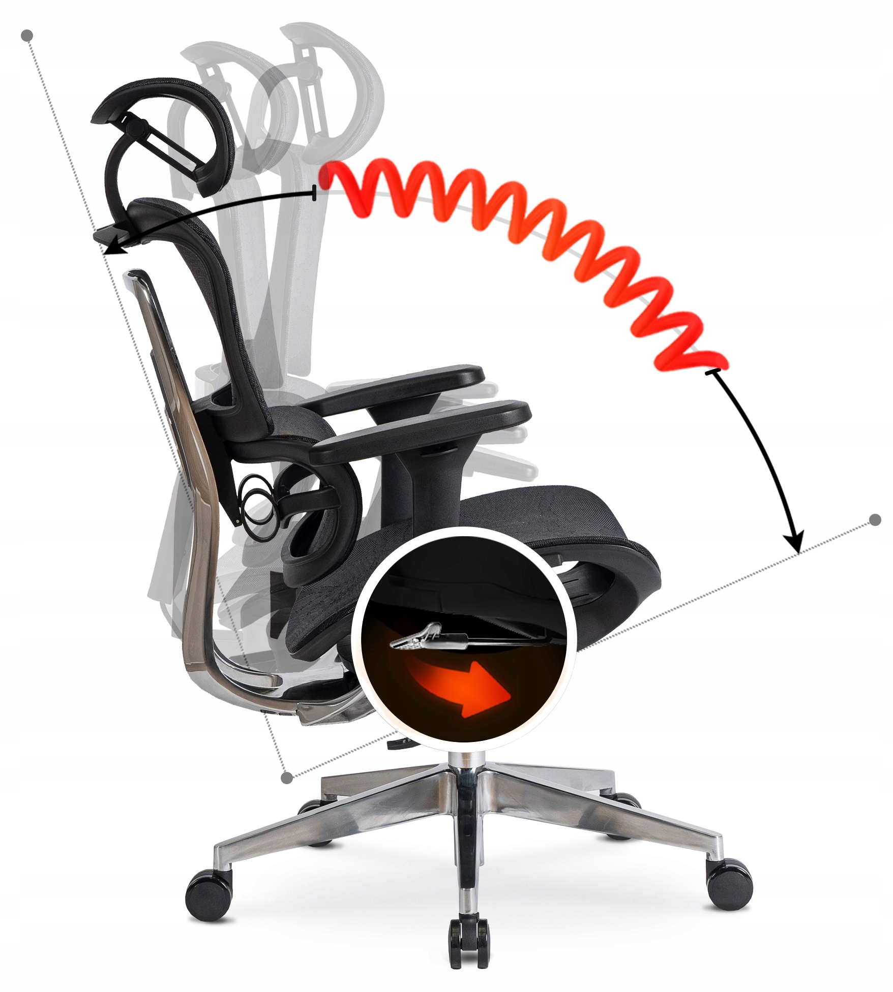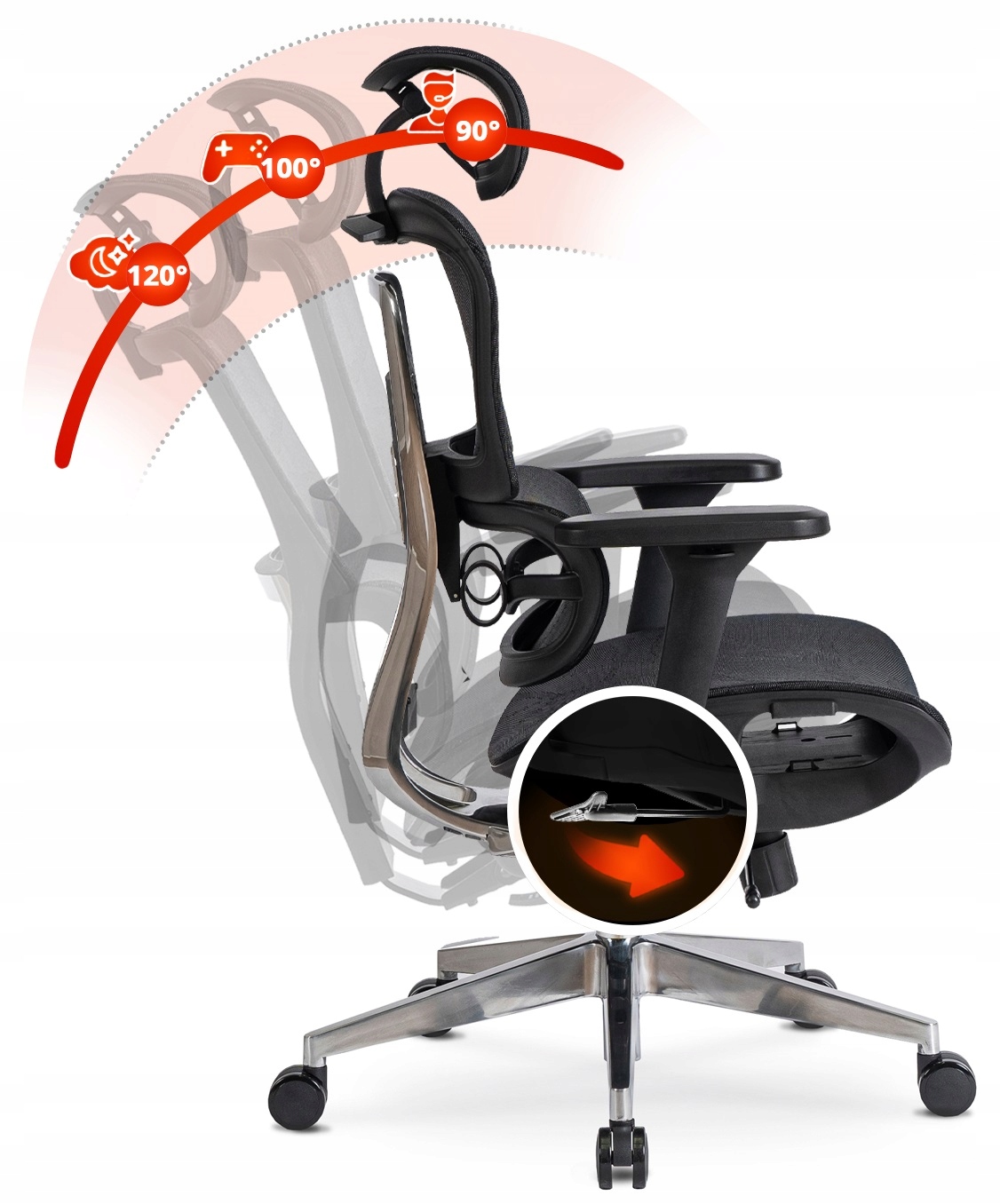 Ponadto pozwoli Ci na odchylenie oparcia z bazowych 90° względem siedziska do 100° i 120° z opcją blokady w takowej pozycji, więc gdy tylko najdzie Cię taka ochota to możesz niemal położyć się w swoim fotelu biurowym. Wysokość samego oparcia można też regulować.