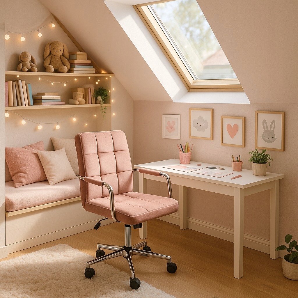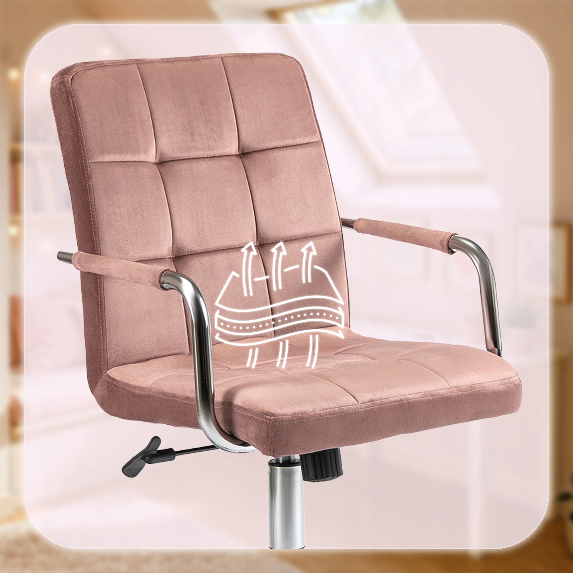 - Płynna regulacja wysokości – dopasuj fotel do biurka, toaletki lub stołu roboczego.