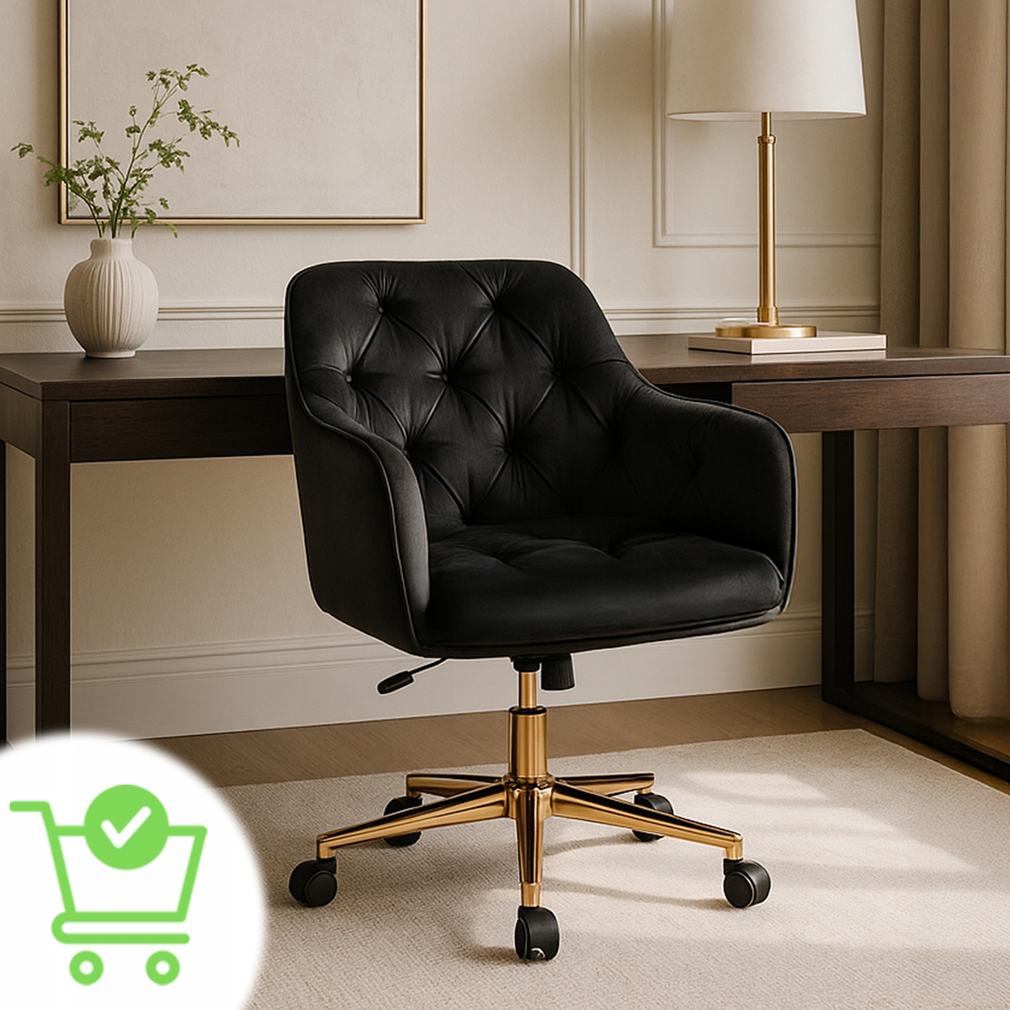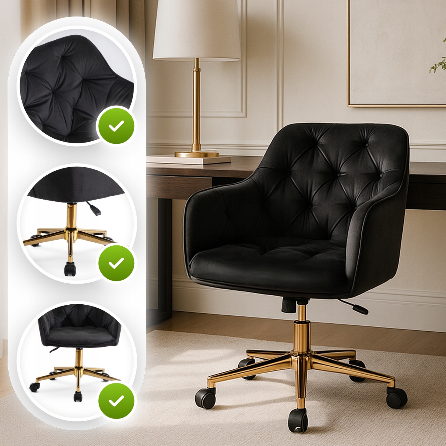 - Stabilna, złota podstawa z pięcioma kółkami – wygodne przemieszczanie się bez wstawania.