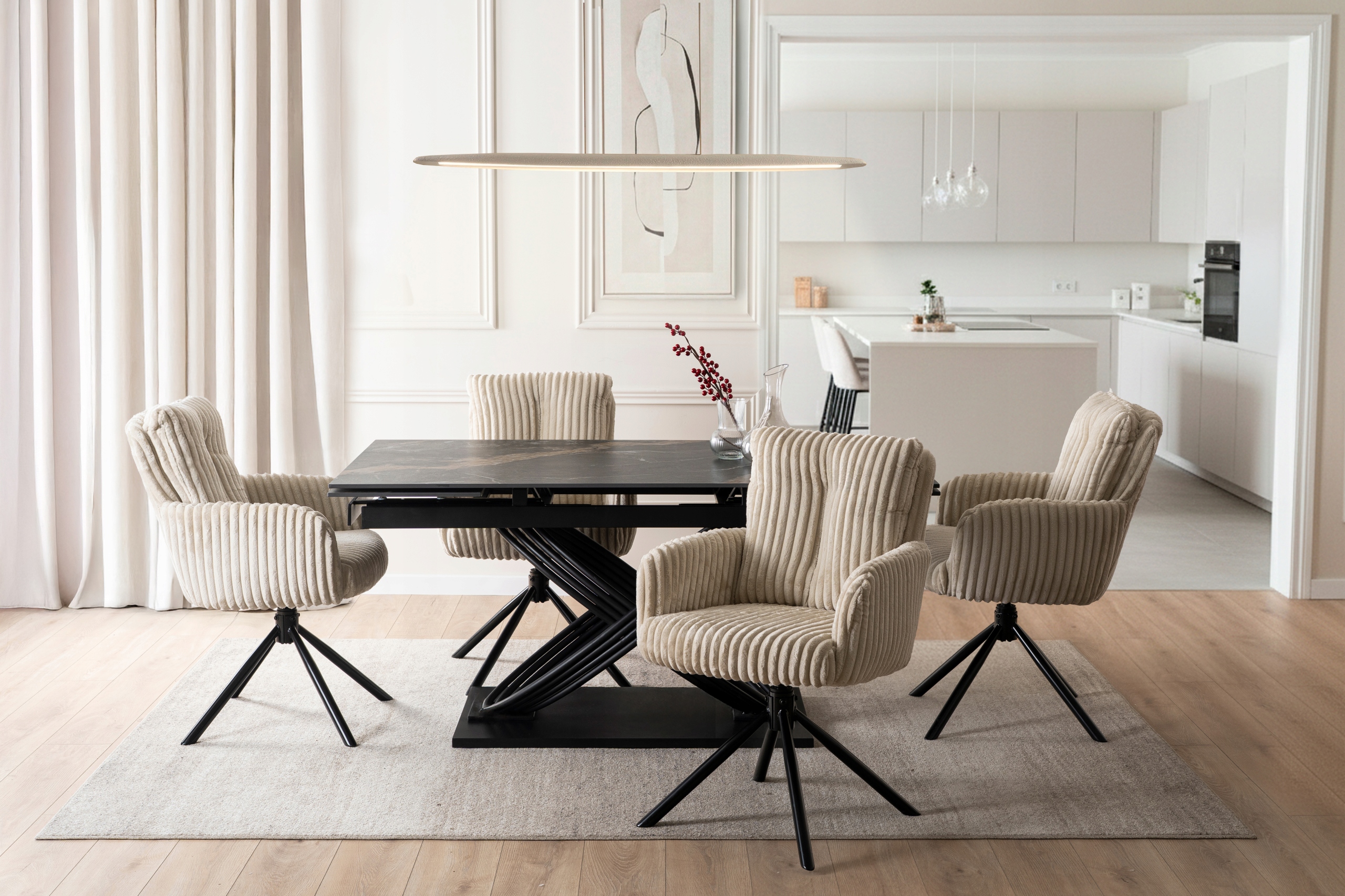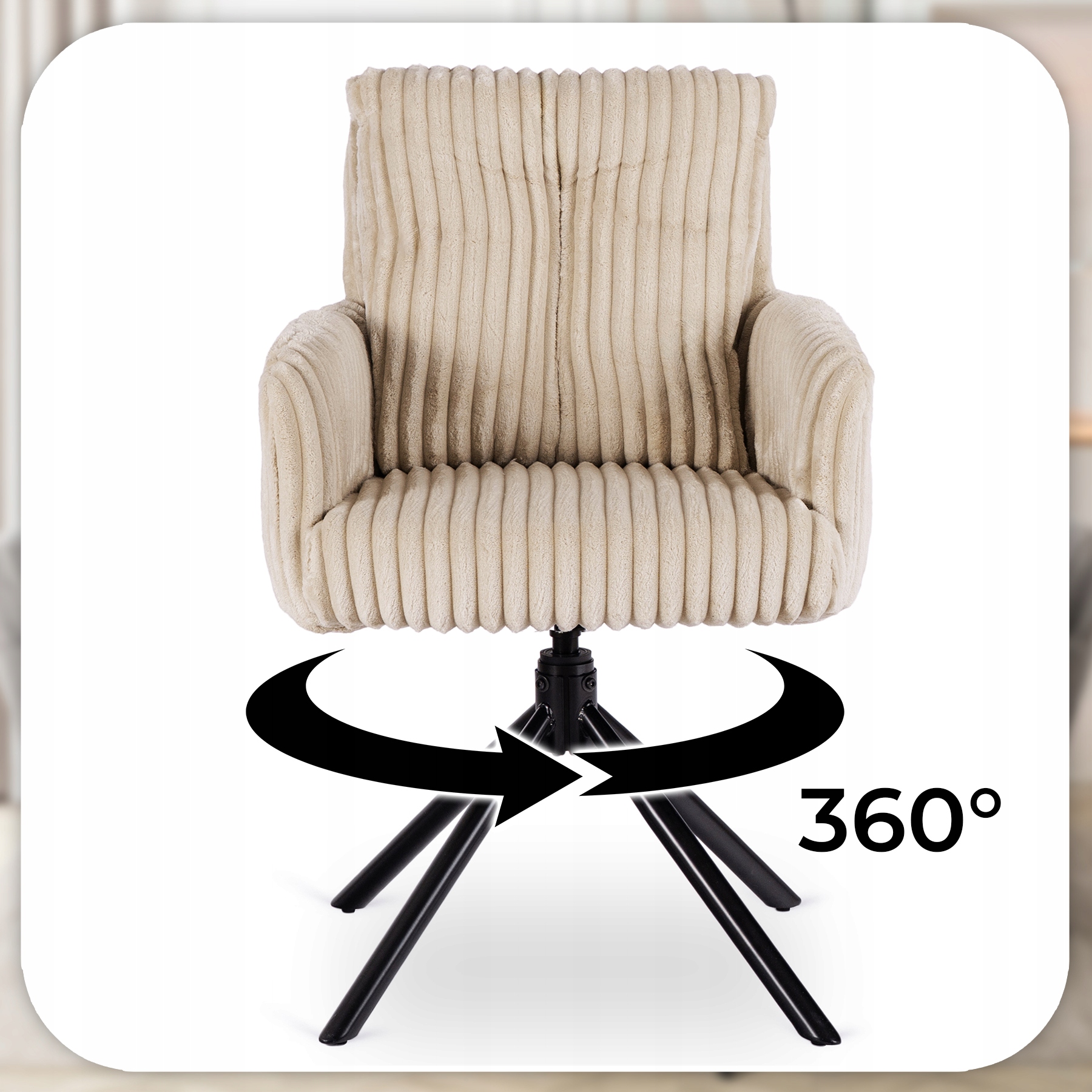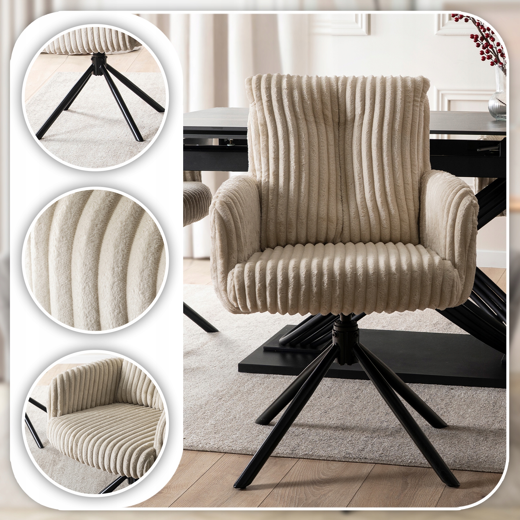 Krzesło JUNE w kolorze beżowym to elegancka propozycja łącząca nowoczesny design i komfort. Grube siedzisko, miękka poduszka oparcia oraz funkcja obrotu 360° zapewniają wygodę i praktyczność. Idealne do jadalni, kuchni, salonu oraz przestrzeni komercyjnych.