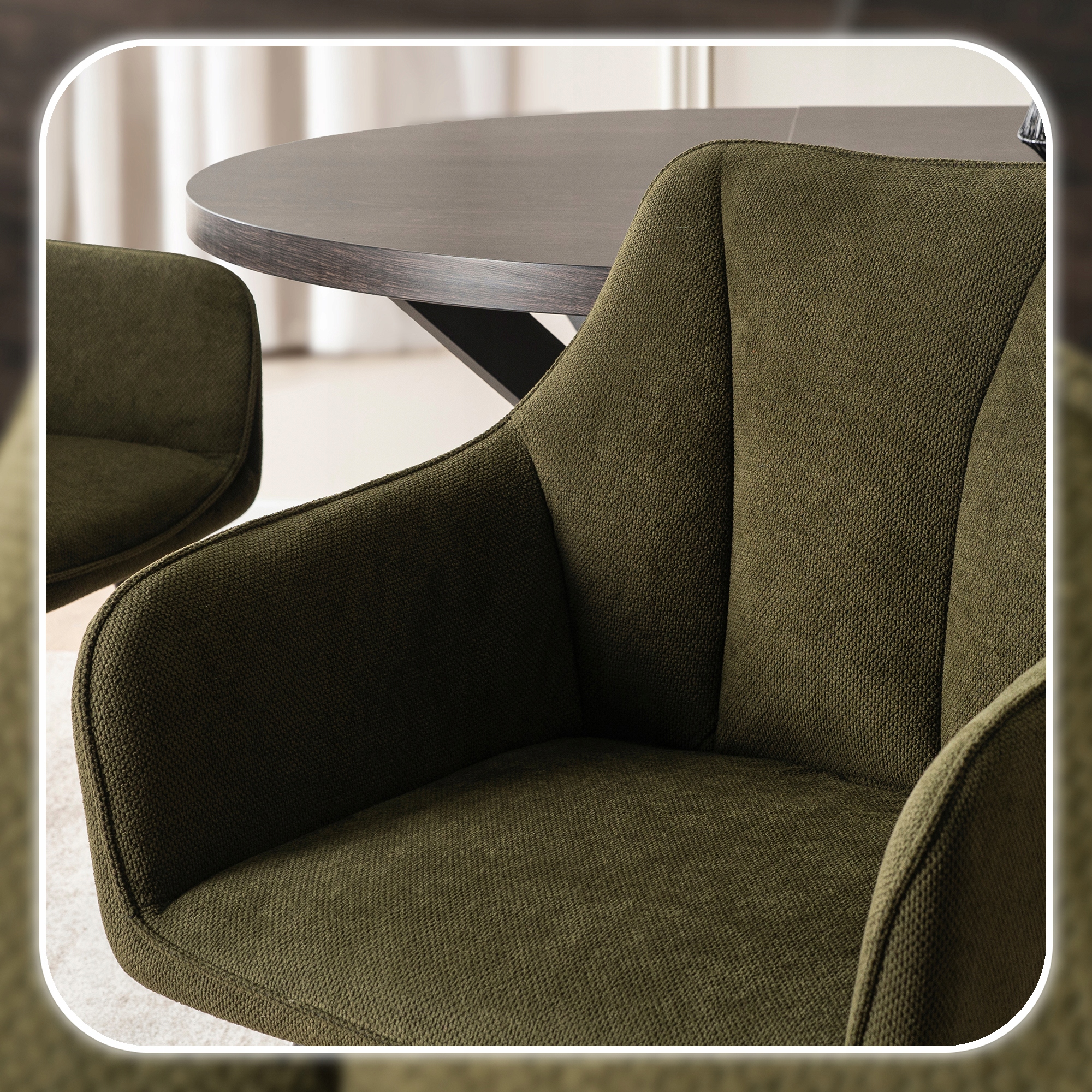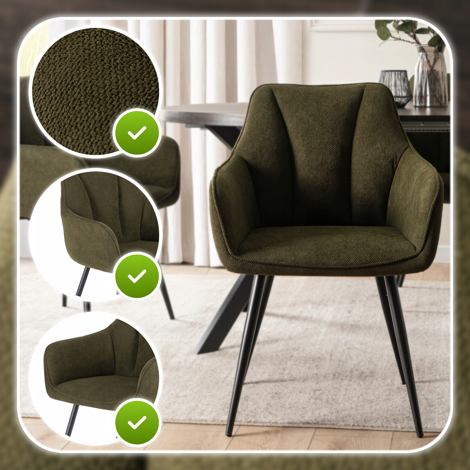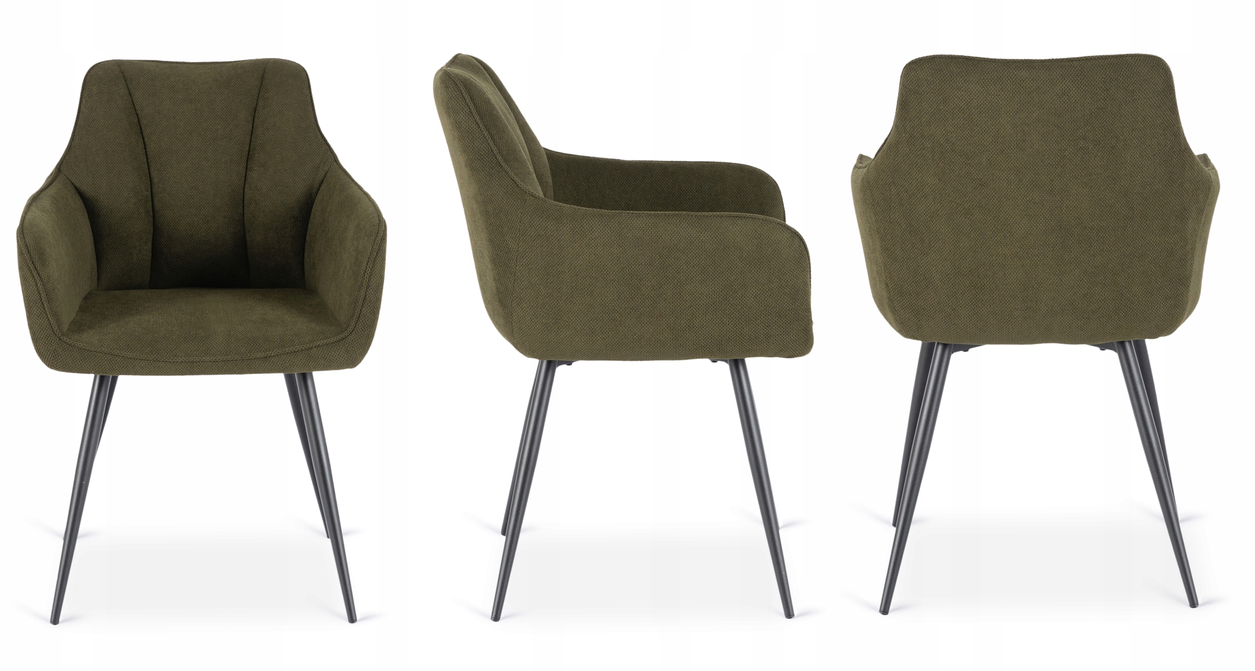 Krzesło w kolorze zielonym to połączenie nowoczesnego designu i wygody. Miękka tapicerka z tkaniny teddy sprawia, że siedzisko jest niezwykle przyjemne w dotyku, a ergonomiczne oparcie z podłokietnikami zapewnia komfort użytkowania. Stabilne, czarne nogi malowane proszkowo gwarantują trwałość i nowoczesny wygląd. To idealny wybór do jadalni, salonu, kuchni, a także do eleganckich przestrzeni komercyjnych.