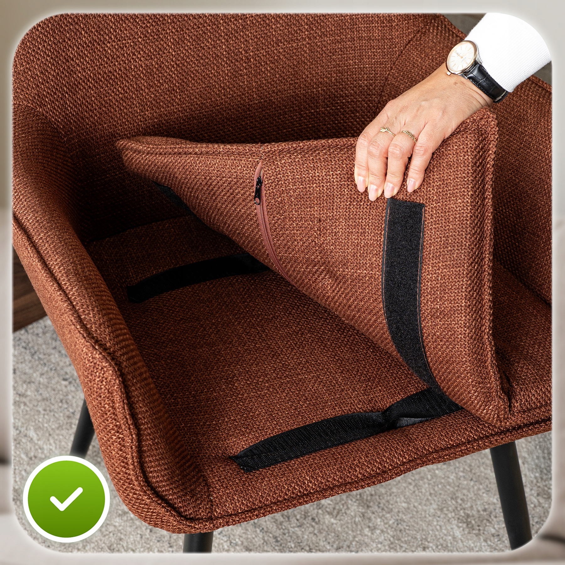 Mocne pasy z rzepami stabilnie trzymają poduszkę w jednym miejscu, zapobiegając jej przesuwaniu podczas siedzenia. Gdy potrzebujesz odświeżyć wnętrze krzesła lub dokładnie wyczyścić tapicerkę – jednym ruchem zdejmujesz poduszkę i gotowe.