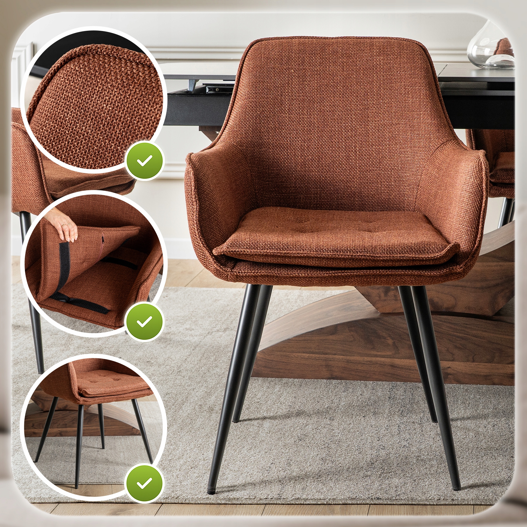 Krzesło EDRICK w kolorze rudym to elegancka propozycja łącząca nowoczesny design i komfort. Miękkie siedzisko na rzep, wyprofilowane oparcie zapewniają wygodę i praktyczność. Idealne do jadalni, kuchni, salonu oraz przestrzeni komercyjnych.
