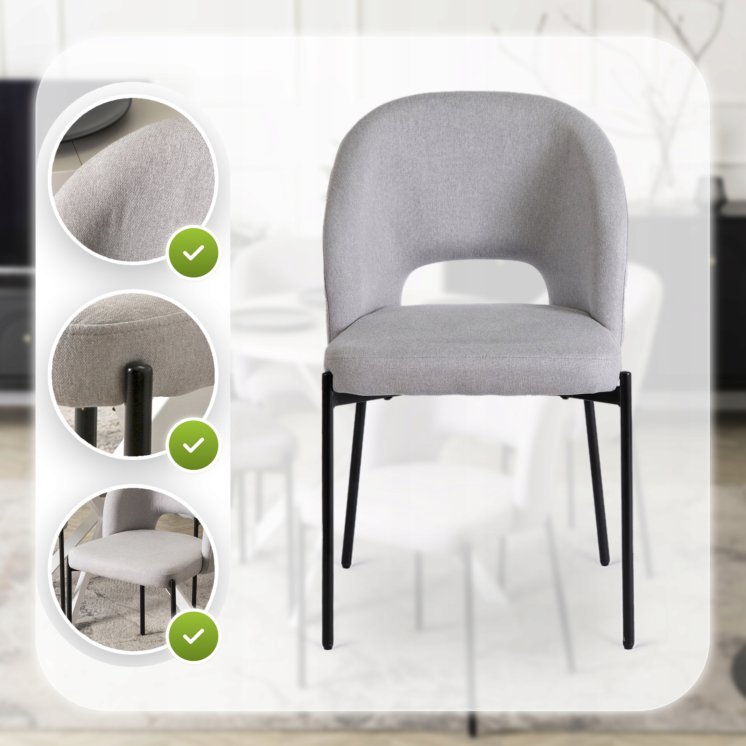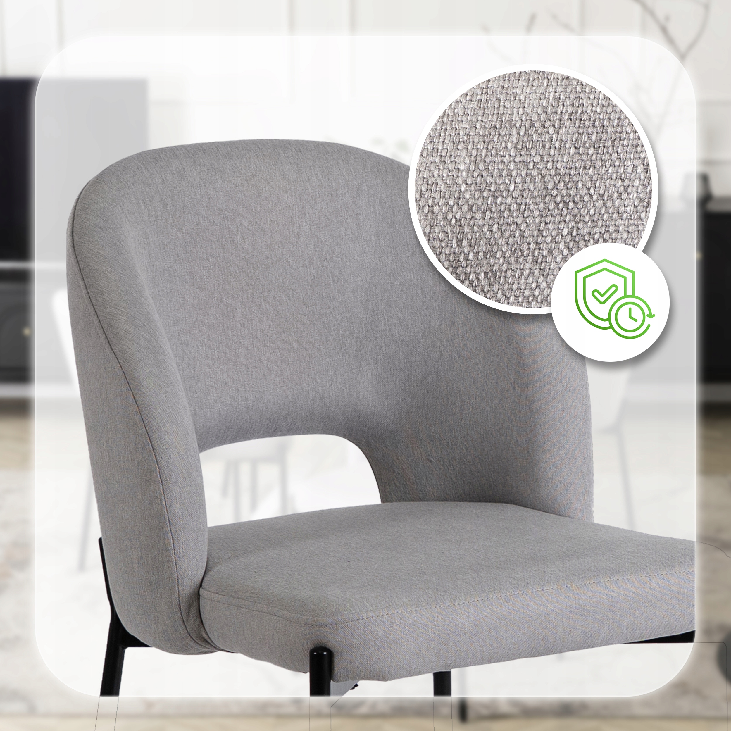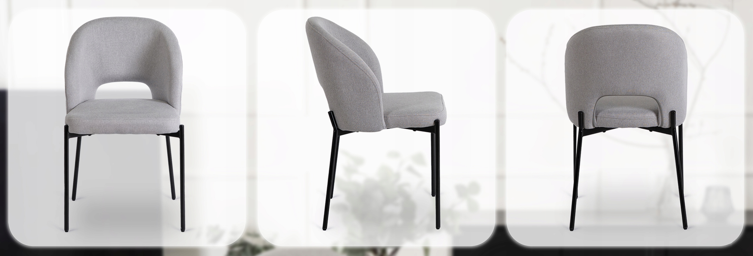 Stylowe krzesło BROS łączy komfort i elegancję. Miękkie, szare siedzisko i czarne metalowe nogi tworzą nowoczesny design pasujący do każdej aranżacji.