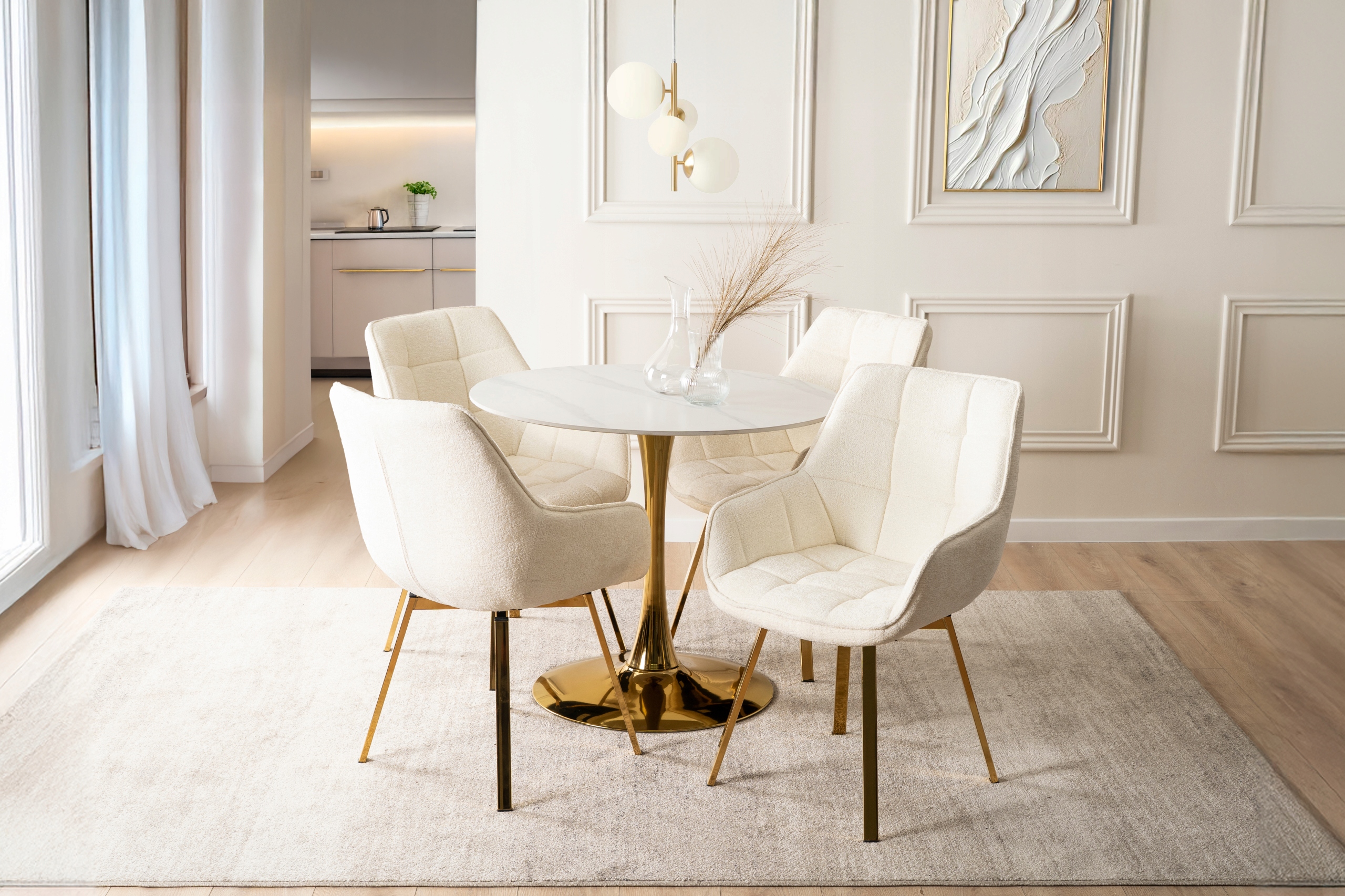 - Stabilna metalowa konstrukcja – nogi w kolorze złotym malowane proszkowo zapewniają solidność i wytrzymałość.