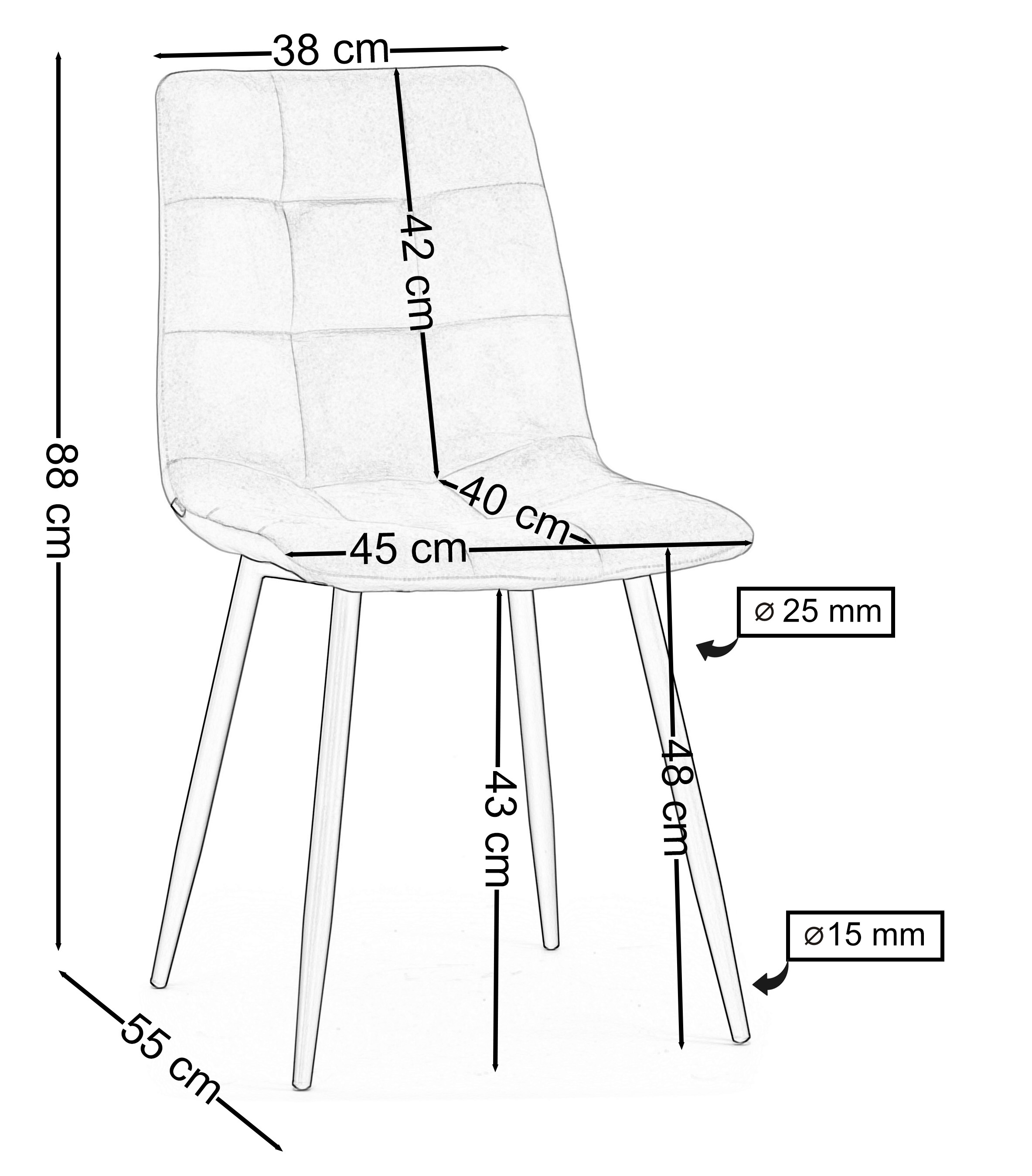 Wykonane z najwyższej jakości surowców. Siedzisko oraz oparcie pokryte jest tkaniną welurową. W krześle zastosowano nogi metalowe pomalowane proszkowo w kolorze czarnym, które dają niepowtarzalny efekt w każdym mieszkaniu. Nogi mają zabezpieczenia przed uszkodzeniem paneli podłogowych, drewnianych podłóg, powierzchni lakierowanych i podłóg ceramicznych.