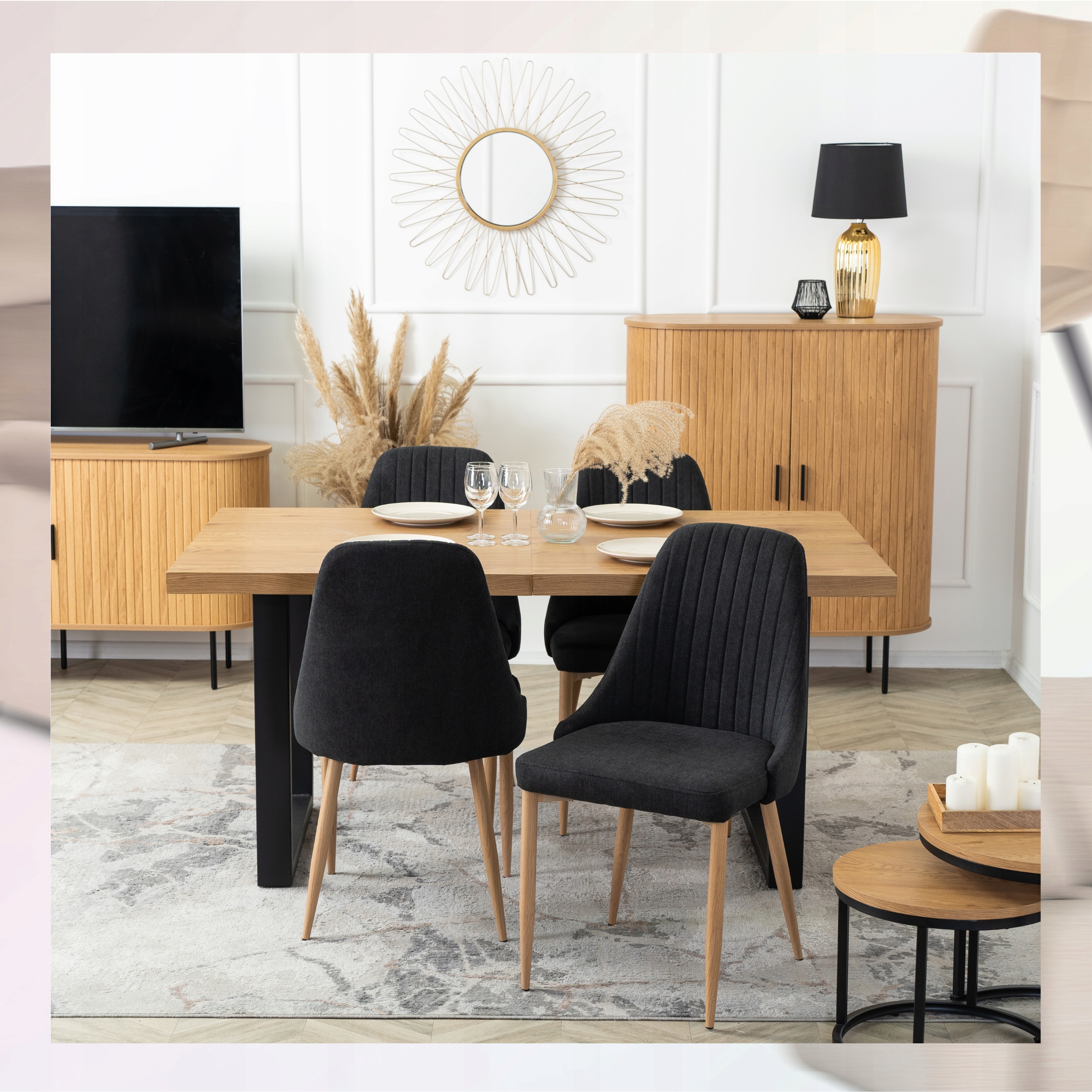 Wytrzymałe stalowe nogi w kolorze naturalnego dębu wprowadzają do przestrzeni elementy natury.