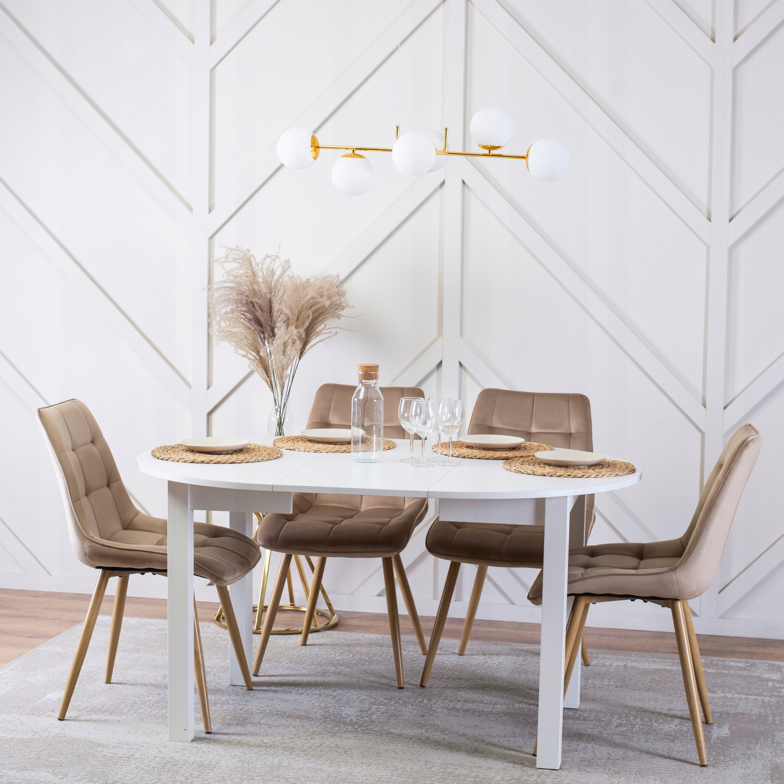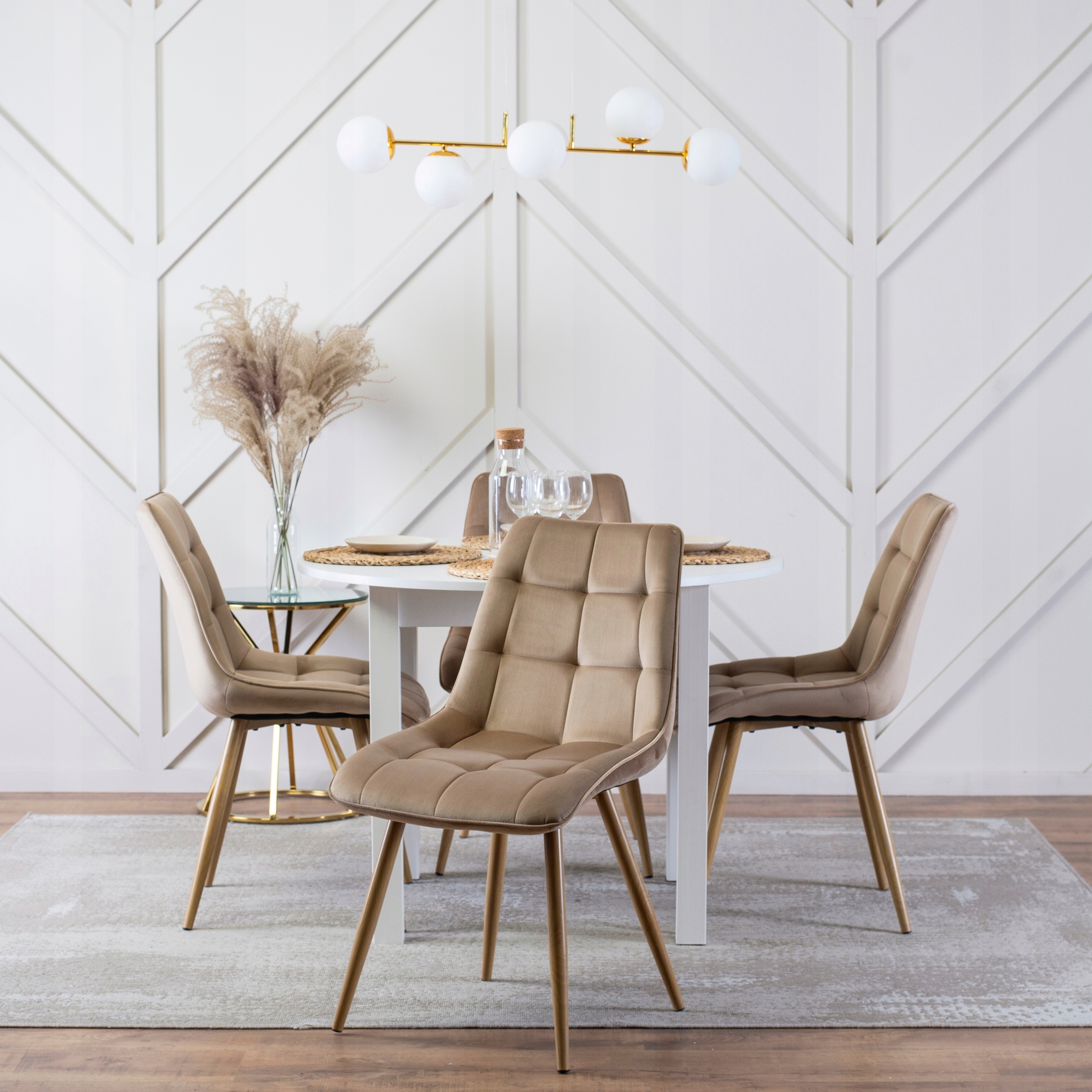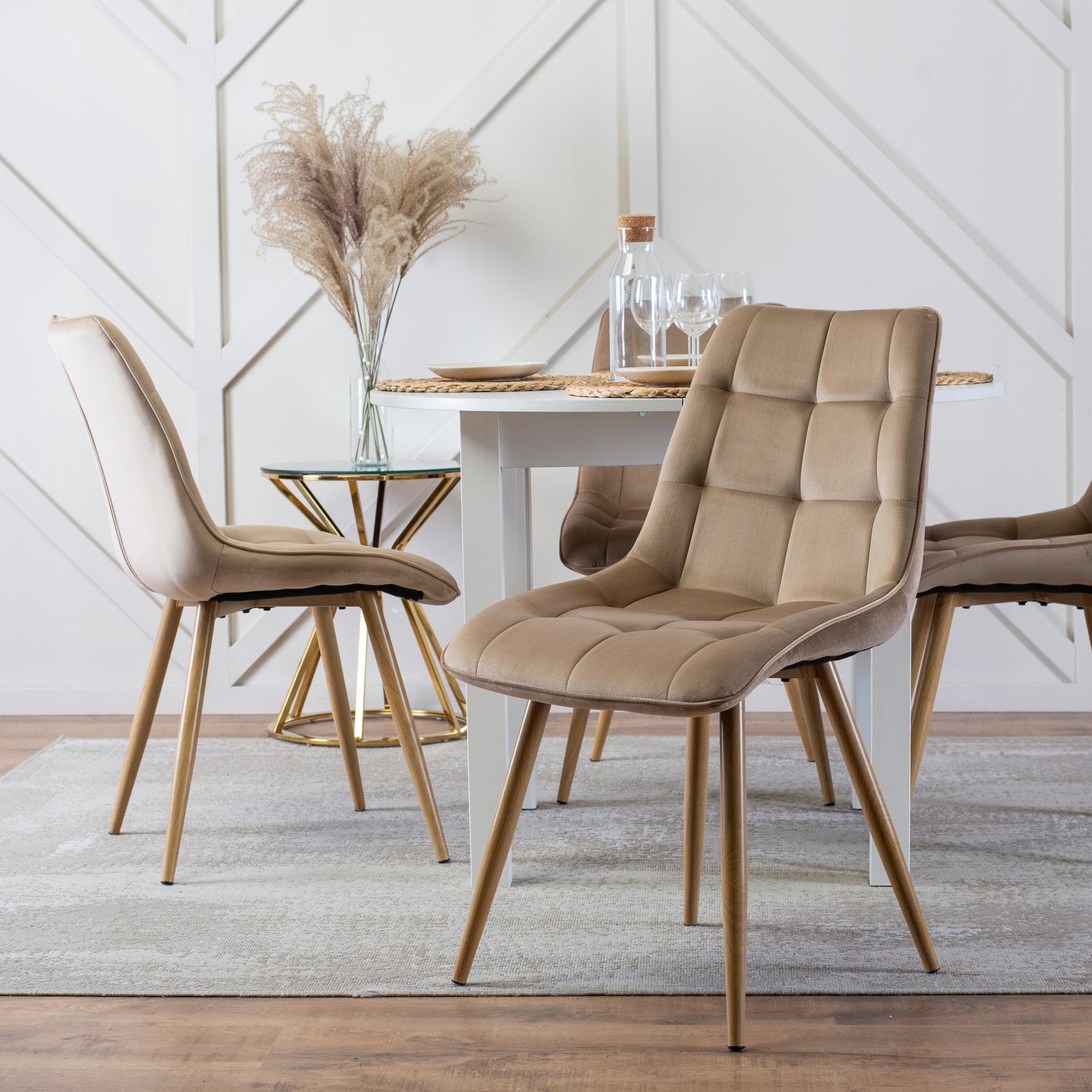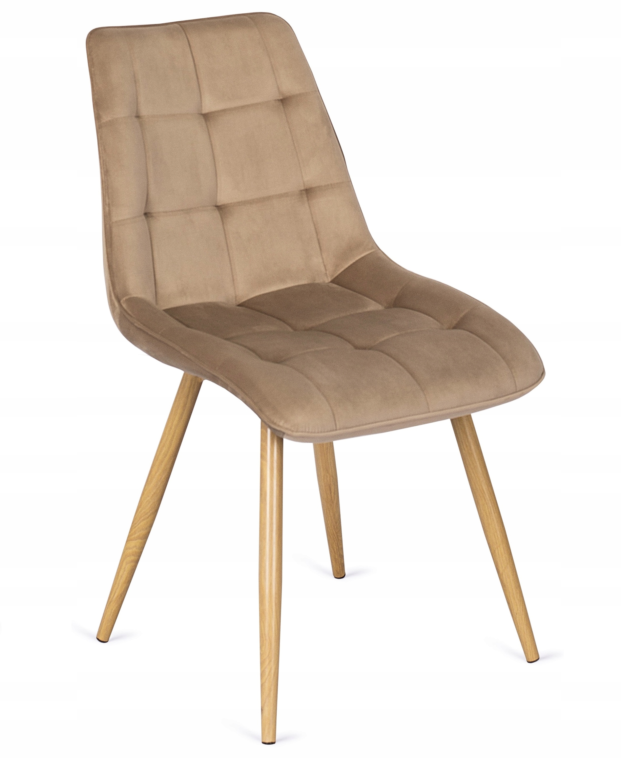- Krzesło welurowe RODRI w kolorze beżowym z nogami dąb złoty
