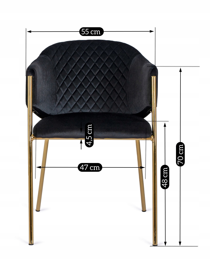 ⭐ Estetyka - tapicerkę stanowi wysokiej jakości tkanina welurowa z dekoracyjnym pikowaniem w romby na wewnętrznej stronie oparcia, a złoty kolor metalowych nóg podkreśla elegancki wygląd krzesła.