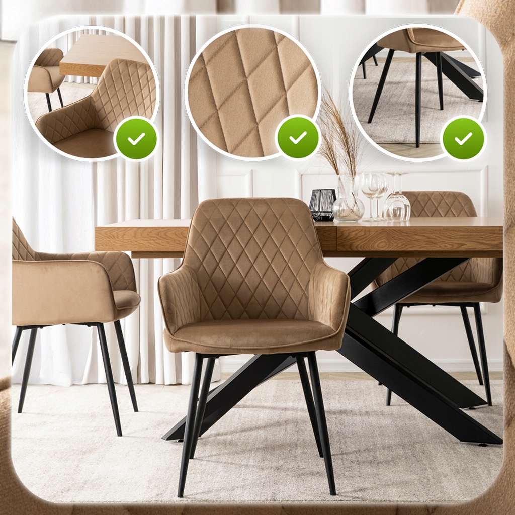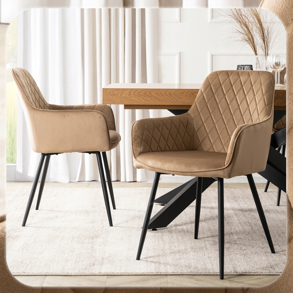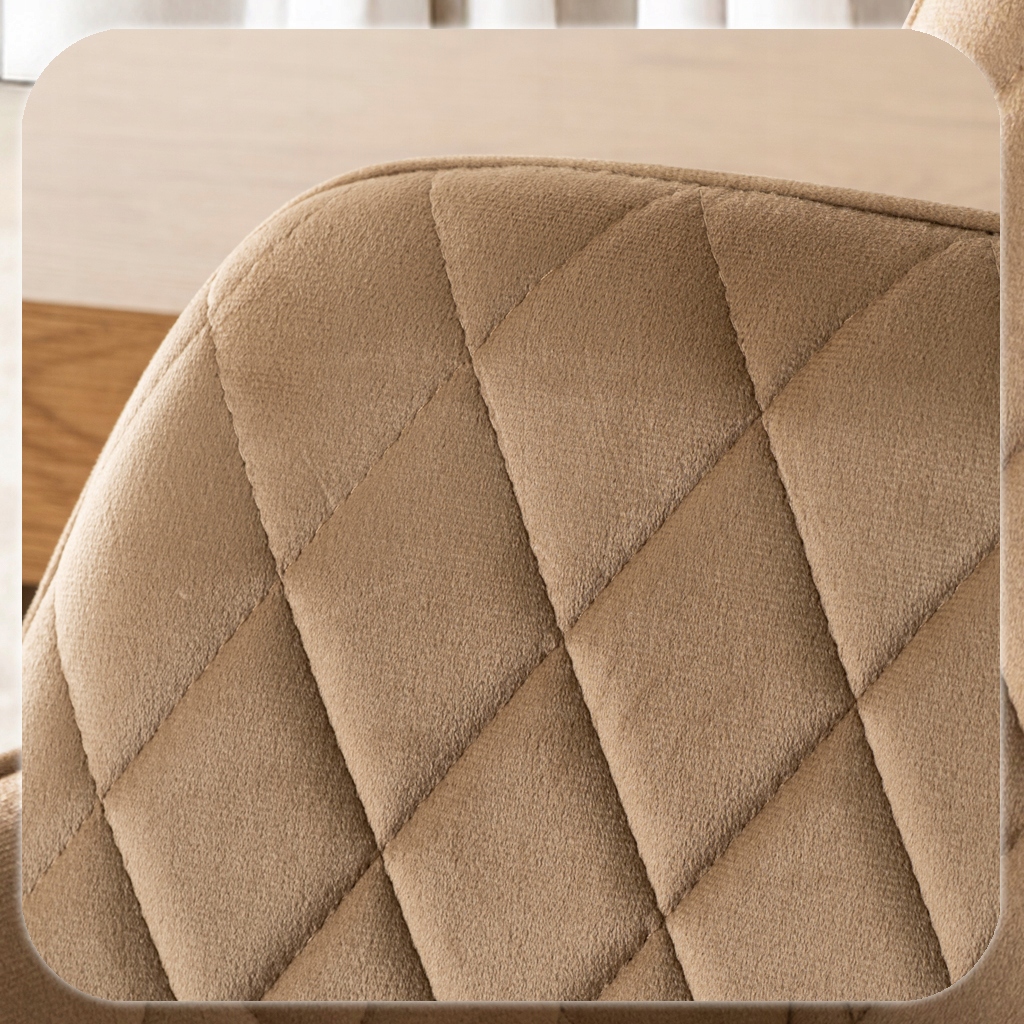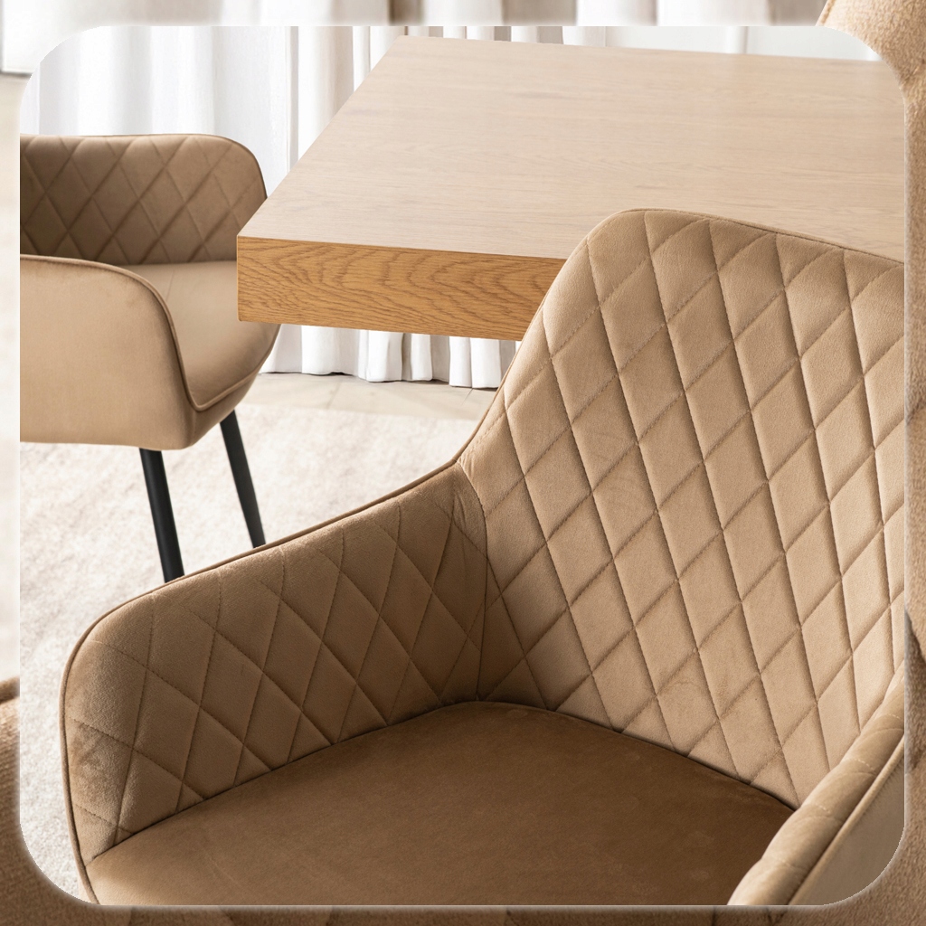 Krzesło BRESSO w kolorze beżowym to elegancka propozycja łącząca nowoczesny design i komfort. Miękkie siedzisko tapicerowane tkaniną welurową oraz wyprofilowane, pikowane oparcie zapewniają wygodę podczas codziennych posiłków i dłuższych spotkań.