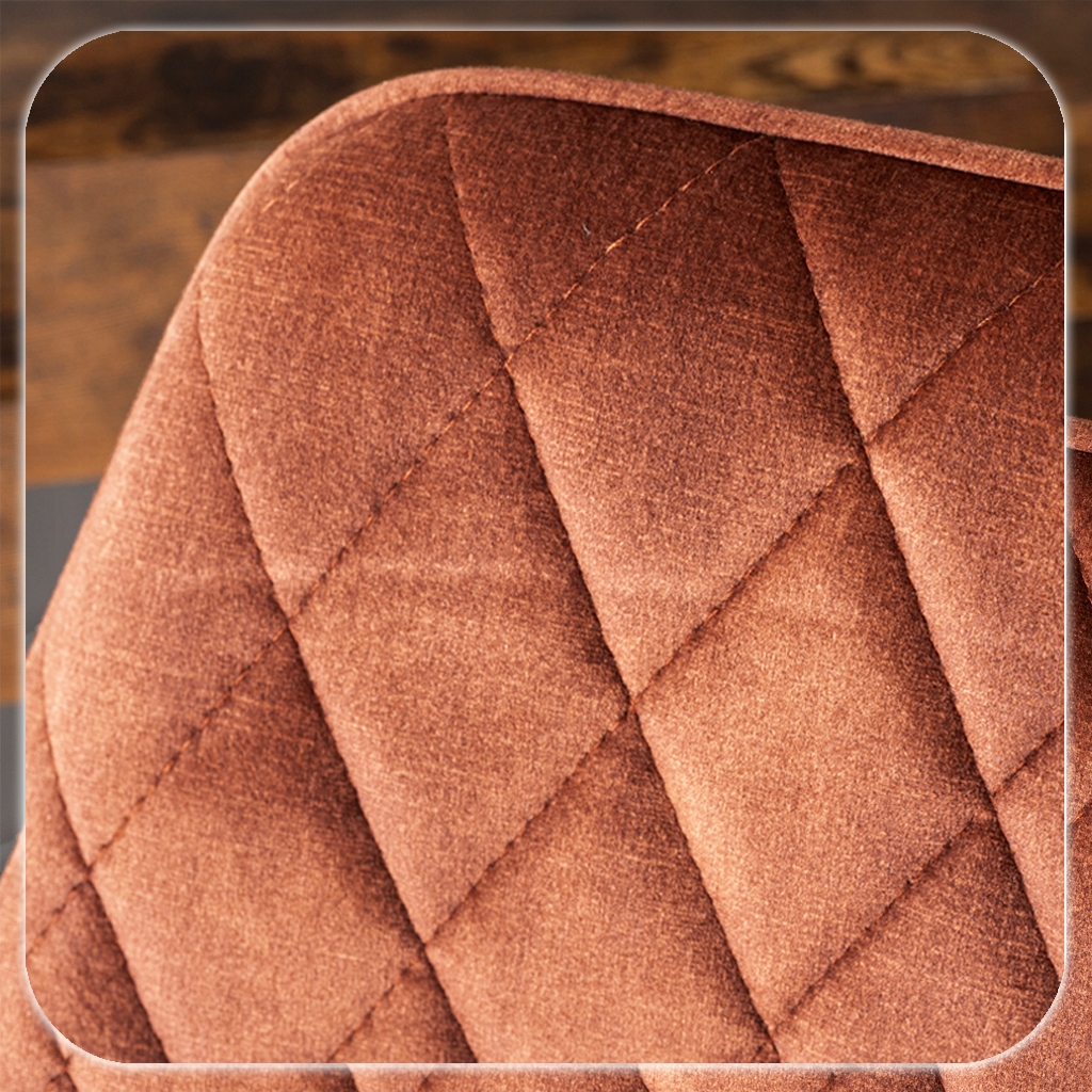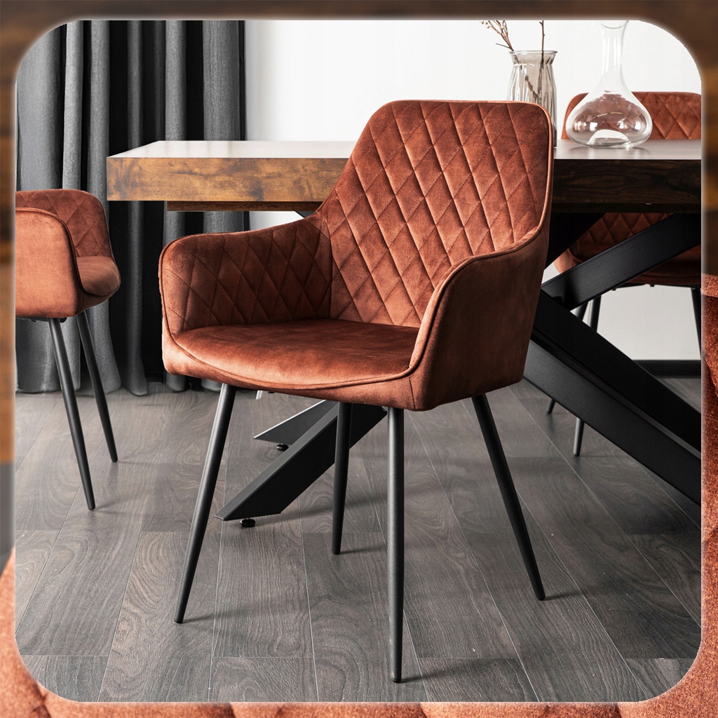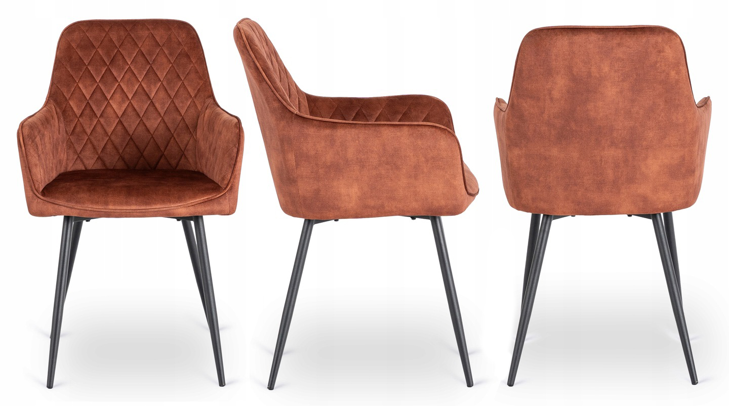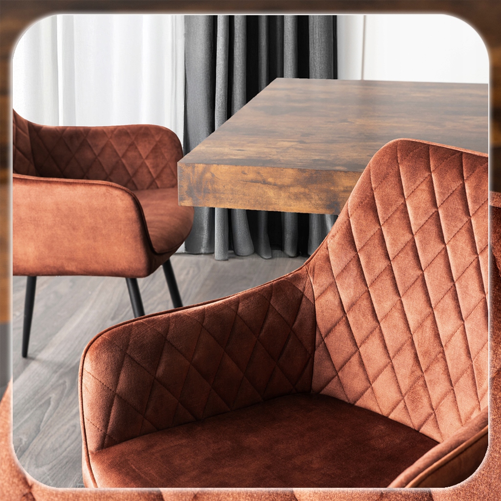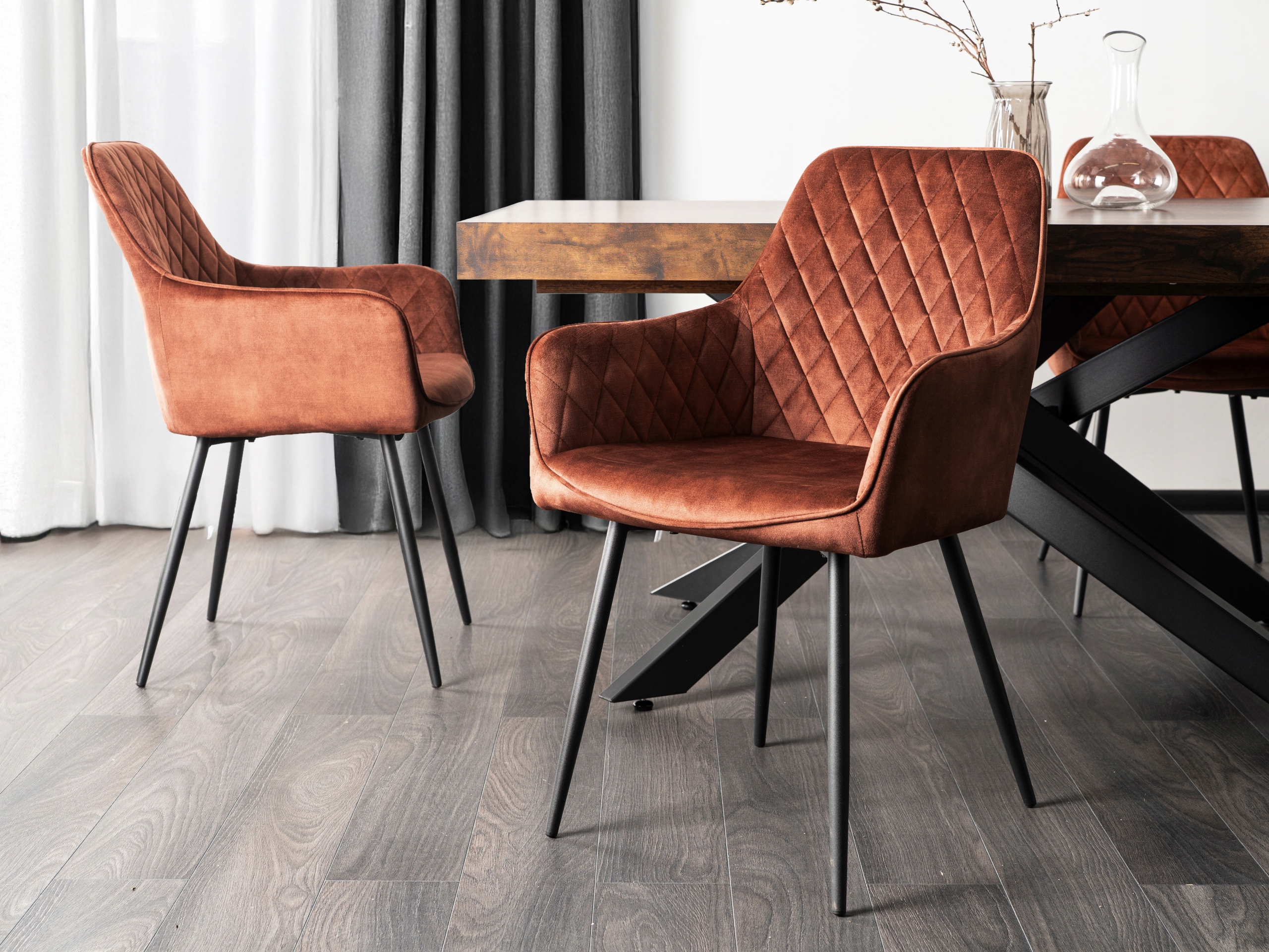 Krzesło BRESSO w kolorze rudym to elegancka propozycja łącząca nowoczesny design i komfort. Miękkie siedzisko tapicerowane tkaniną welurową oraz wyprofilowane, pikowane oparcie zapewniają wygodę podczas codziennych posiłków i dłuższych spotkań.