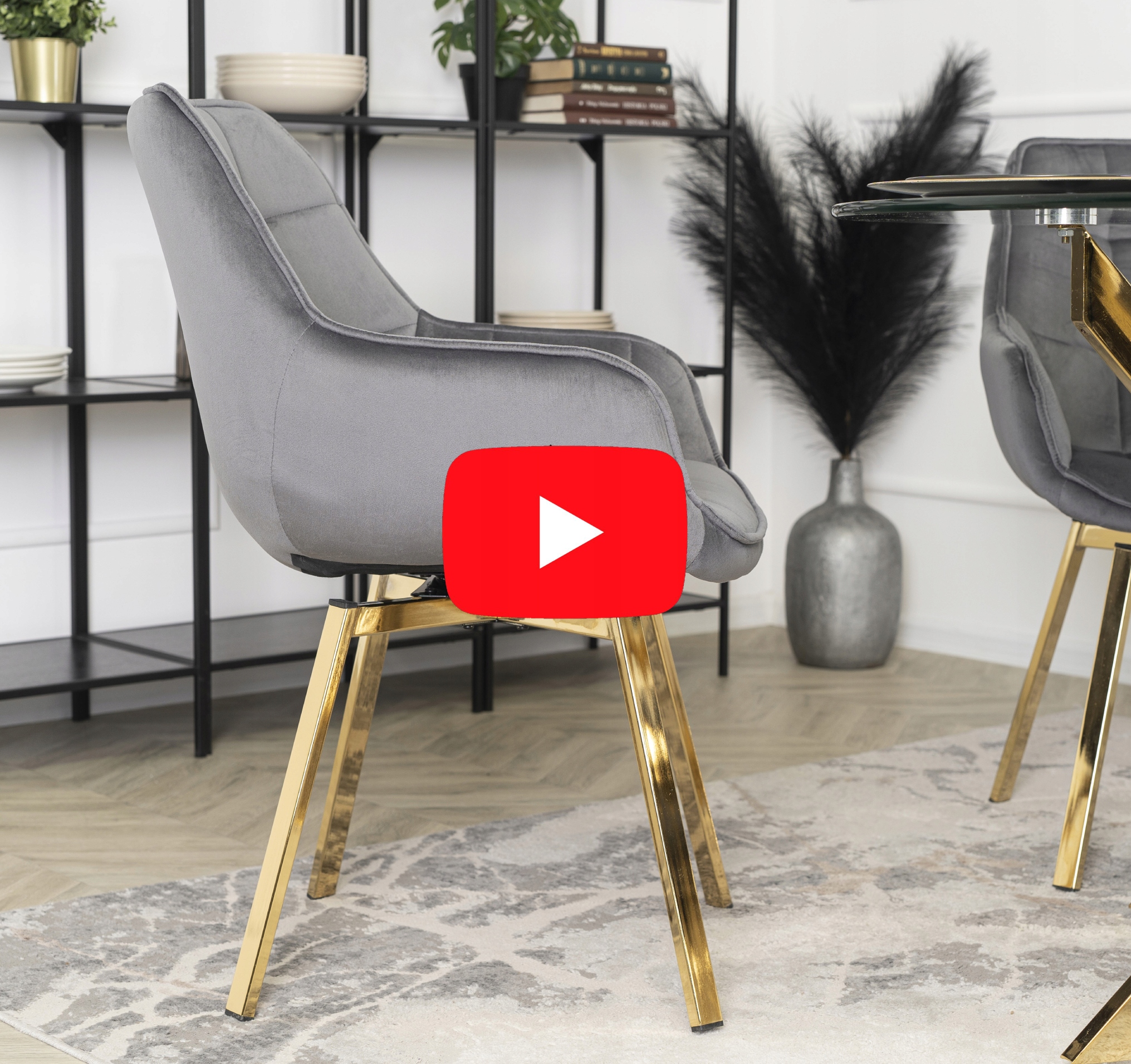 Włącz film i zobacz szczegóły welurowego krzesła z obrotowym siedziskiem.