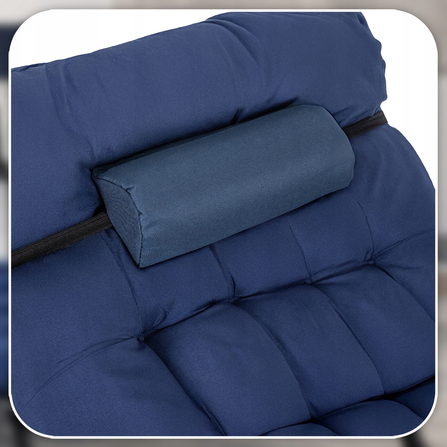 Miękki zagłówek zapewnia wygodne podparcie głowy i karku, zwiększając komfort podczas wypoczynku. Dzięki regulowanemu mocowaniu można łatwo dopasować jego położenie do indywidualnych potrzeb użytkownika.
