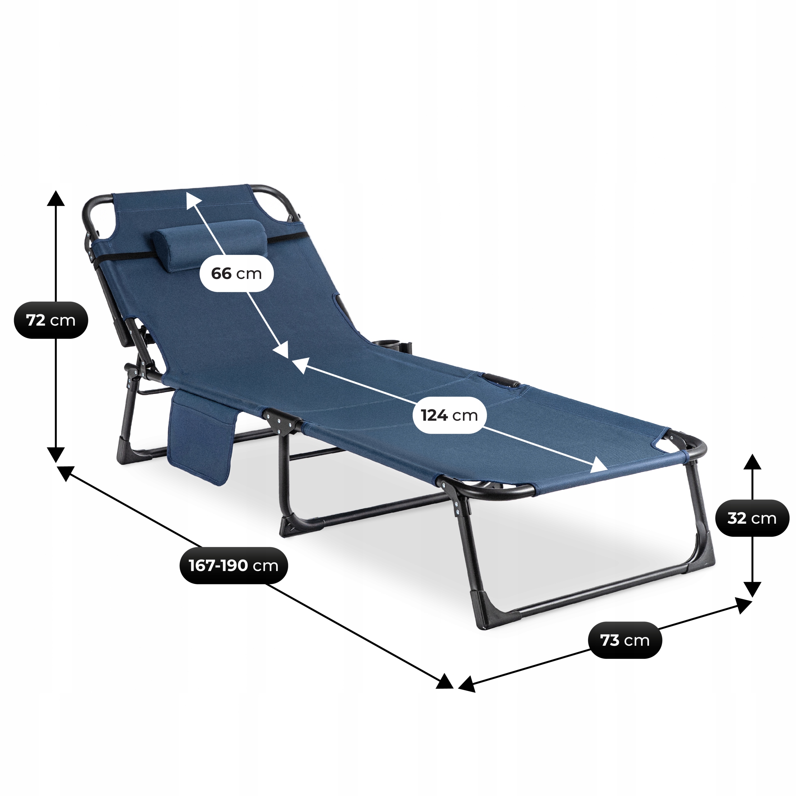 • Regulowana długość całkowita: 167–190 cm (w zależności od kąta pochylenia oparcia)