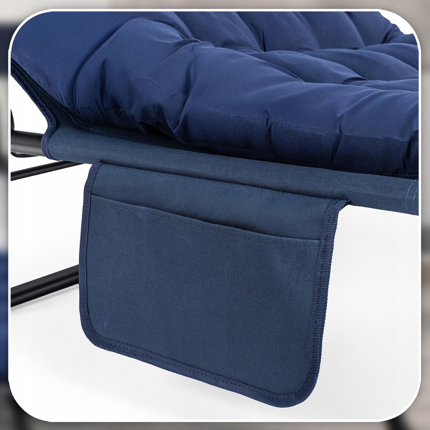Kieszonka zamocowana przy stelażu zapewnia łatwy dostęp do niezbędnych przedmiotów, takich jak książka, pilot czy telefon, bez potrzeby schylania się czy wstawania. Wykonana z trwałej tkaniny odpornej na rozciąganie, bezpiecznie pomieści drobne akcesoria podczas relaksu.