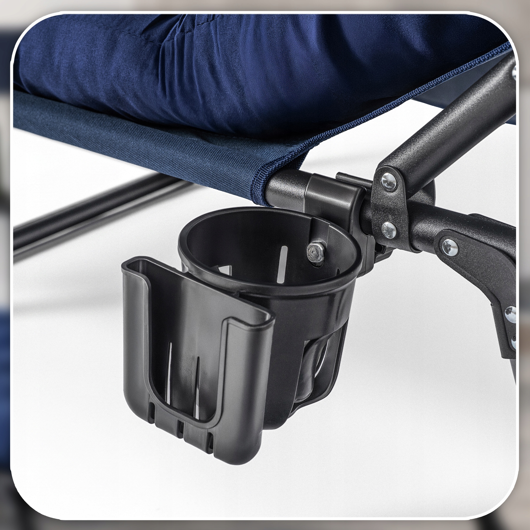 Praktyczny uchwyt zamocowany przy stelażu pozwala bezpiecznie odłożyć kubek, butelkę lub puszkę, zapewniając wygodny dostęp do napoju bez konieczności wstawania.