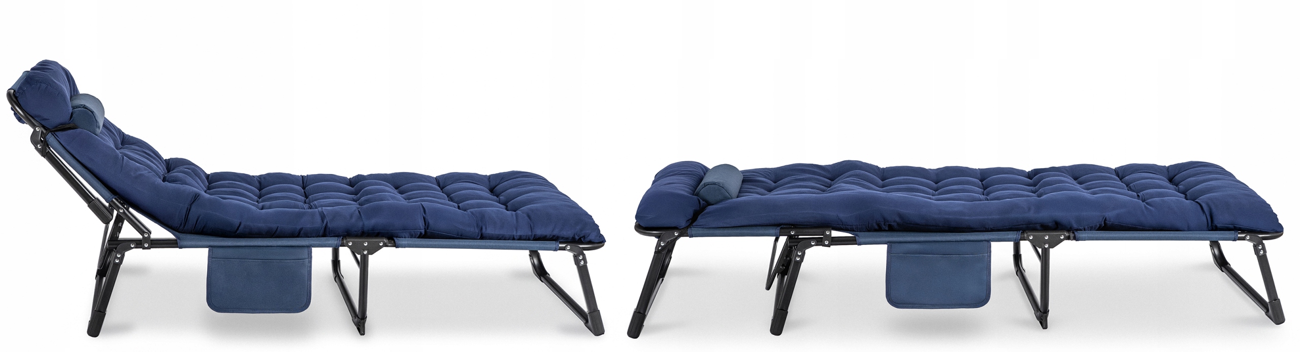 Leżak wyposażony jest w praktyczną kieszeń boczną na drobiazgi (telefon, książka, okulary) oraz zintegrowany, przesuwany zagłówek. Nie wymaga montażu – jest gotowy do użycia zaraz po rozłożeniu.