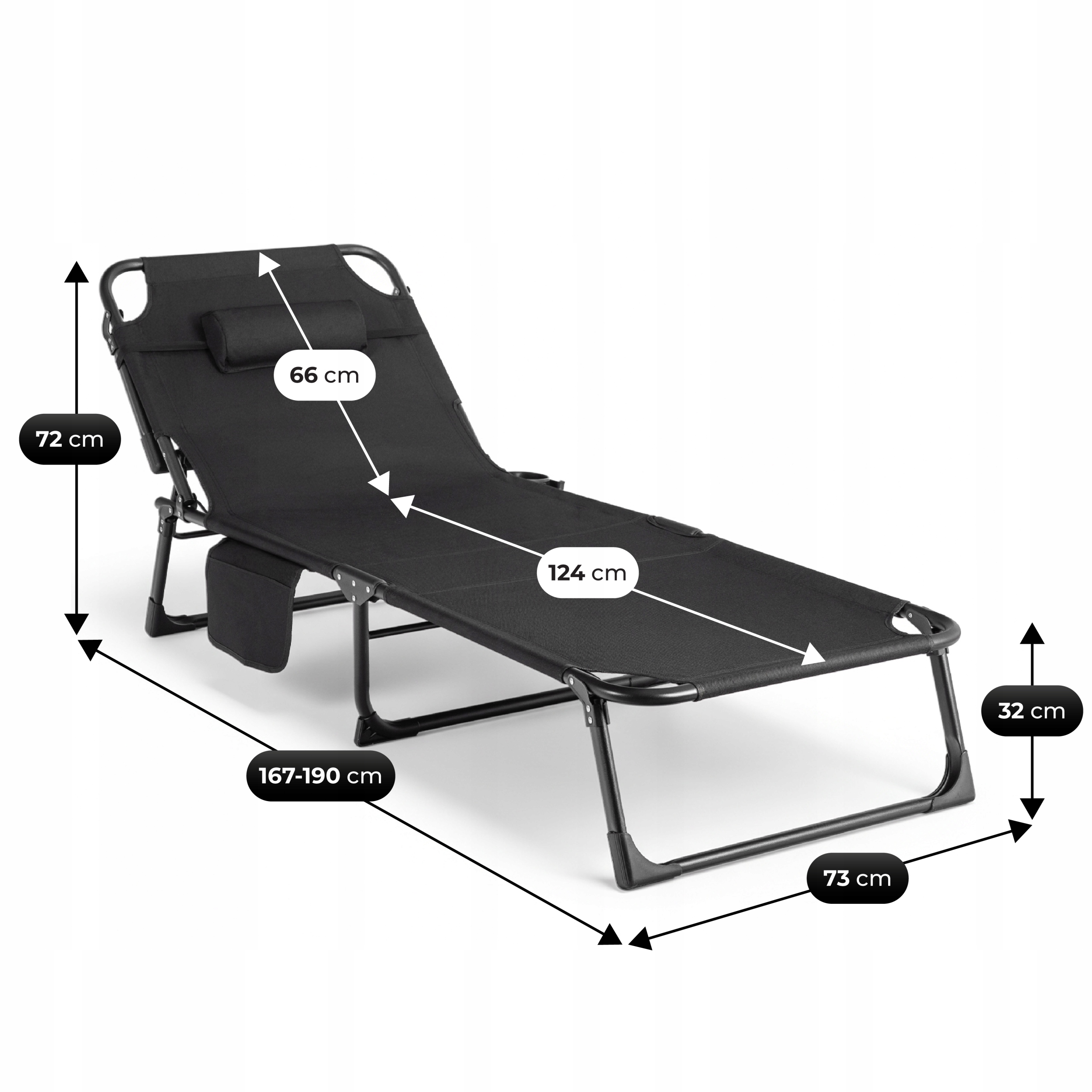 • Regulowana długość całkowita: 167–190 cm (w zależności od kąta pochylenia oparcia)