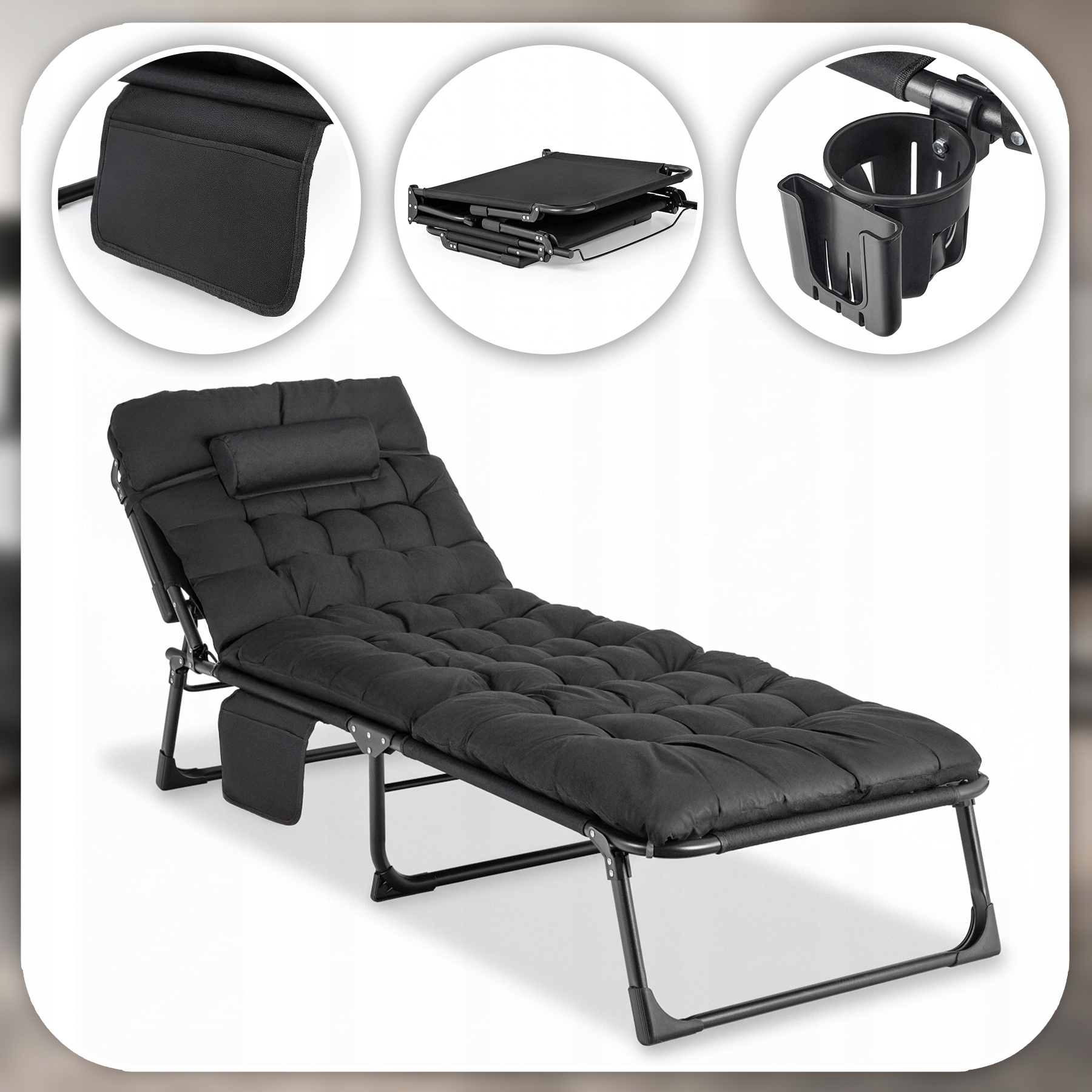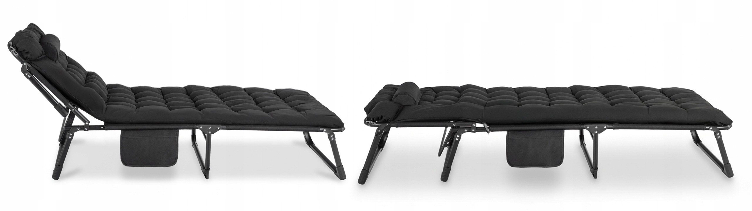 Leżak wyposażony jest w praktyczną kieszeń boczną na drobiazgi (telefon, książka, okulary) oraz zintegrowany, przesuwany zagłówek. Nie wymaga montażu – jest gotowy do użycia zaraz po rozłożeniu.